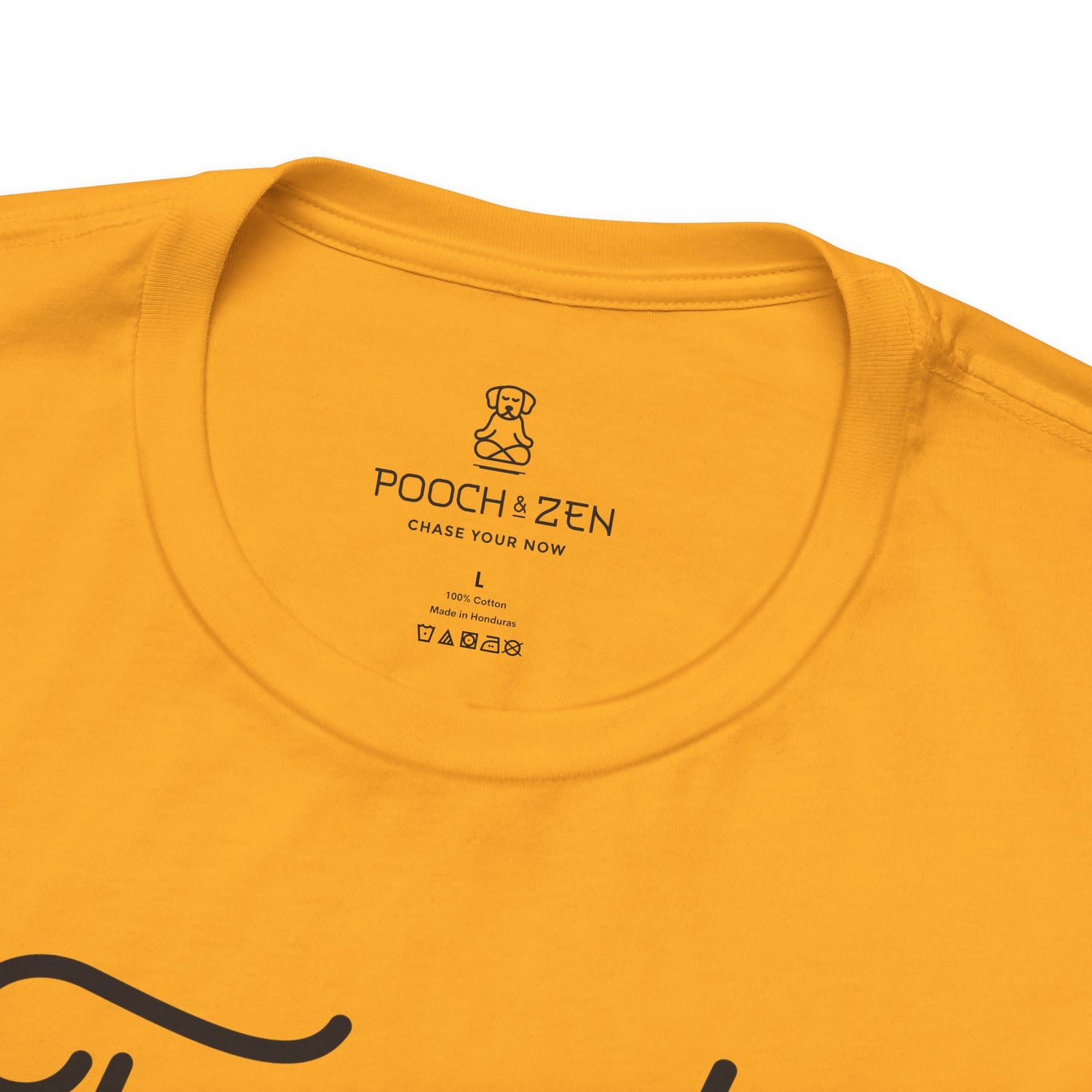 You won't have to worry about annoying tags rubbing the back of your neck. The inside of the tee features the Pooch & Zen logo and that's it. Minimal and cozy.