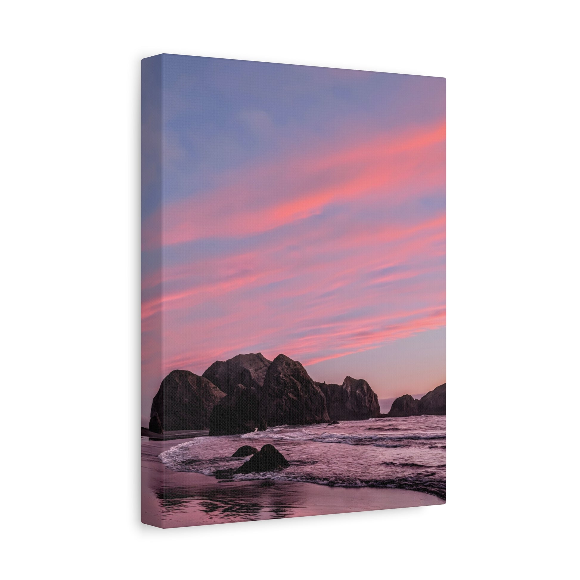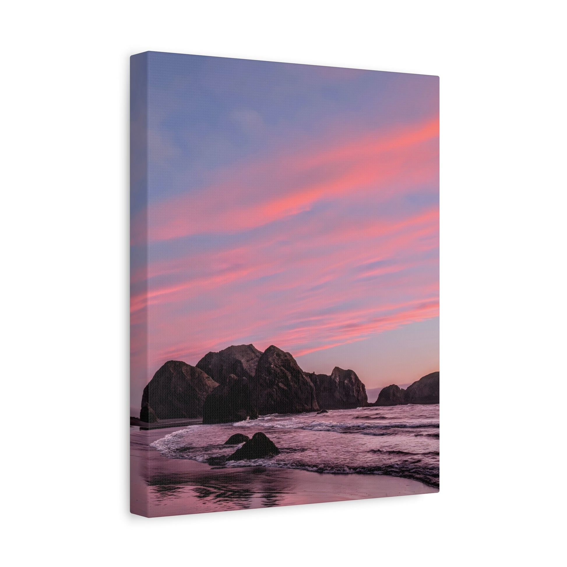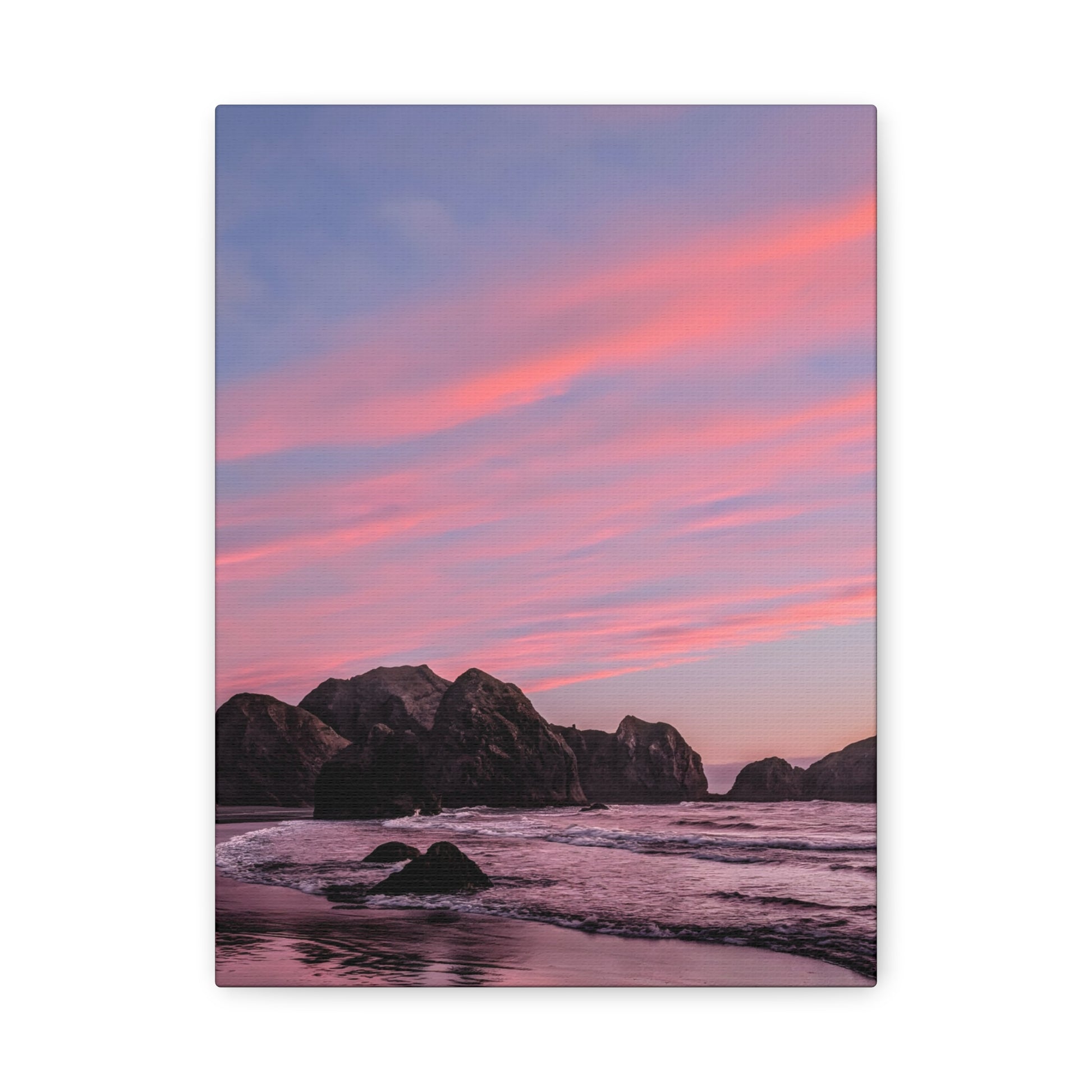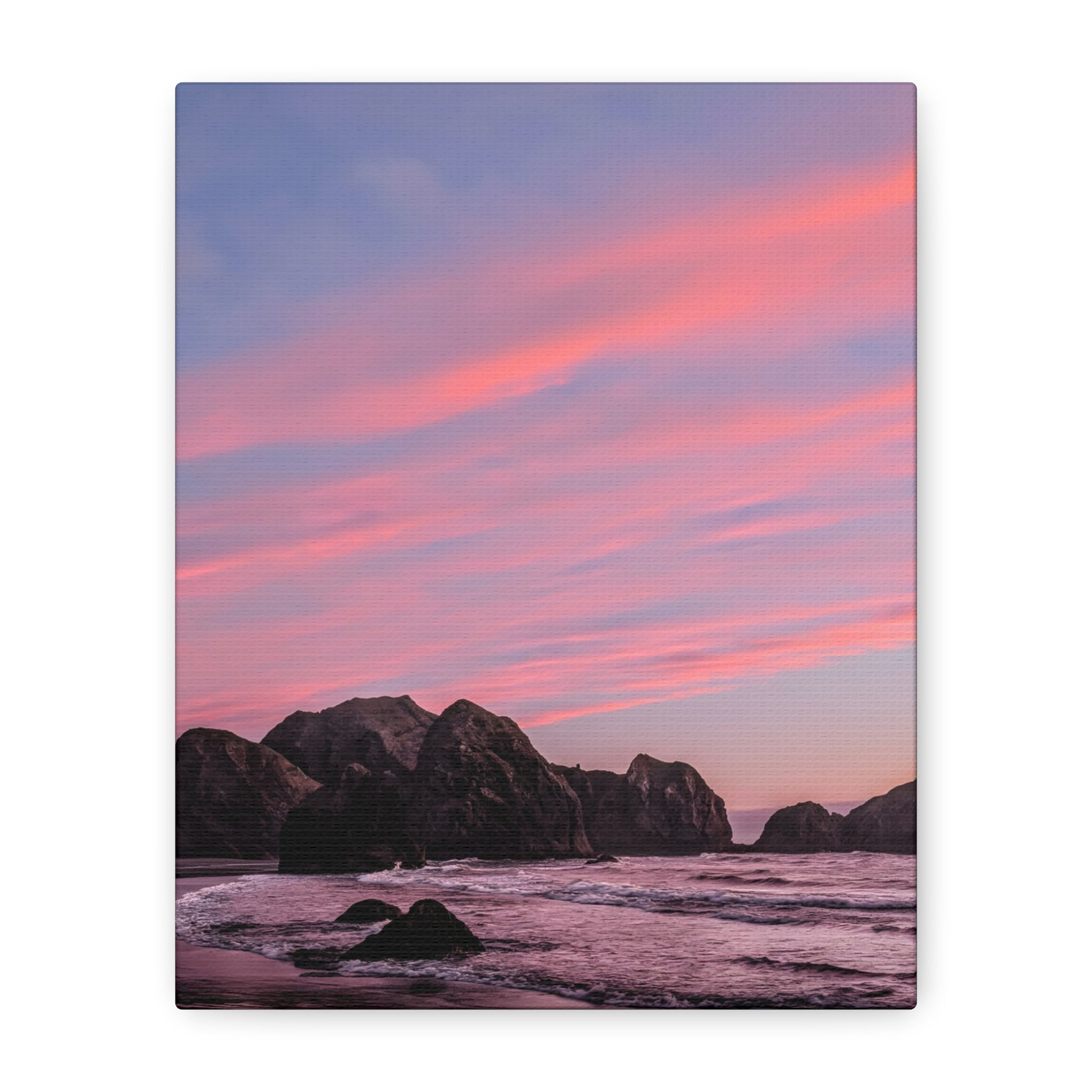 This epic Gold Beach sunset canvas captures the soft cranberry blush and muted rose tones as they melt into the sea. Shot on the shore at Meyers Creek Beach, this print is perfect for bathrooms, bedrooms, or as a gift. Brings the soft coastal vibe to your space and feel the calm.