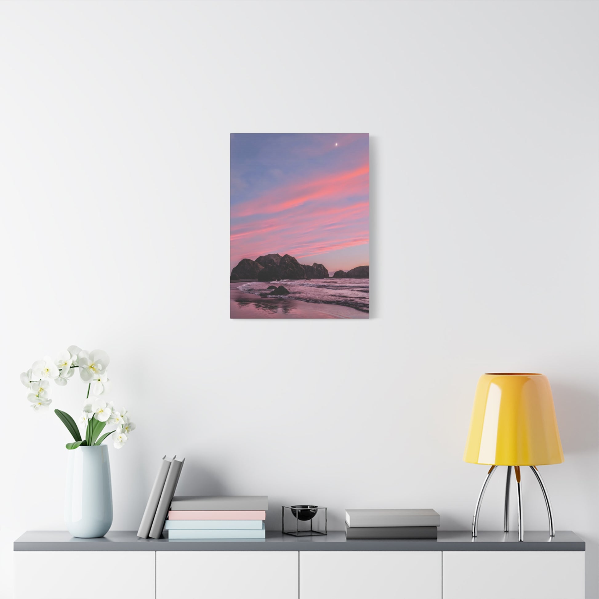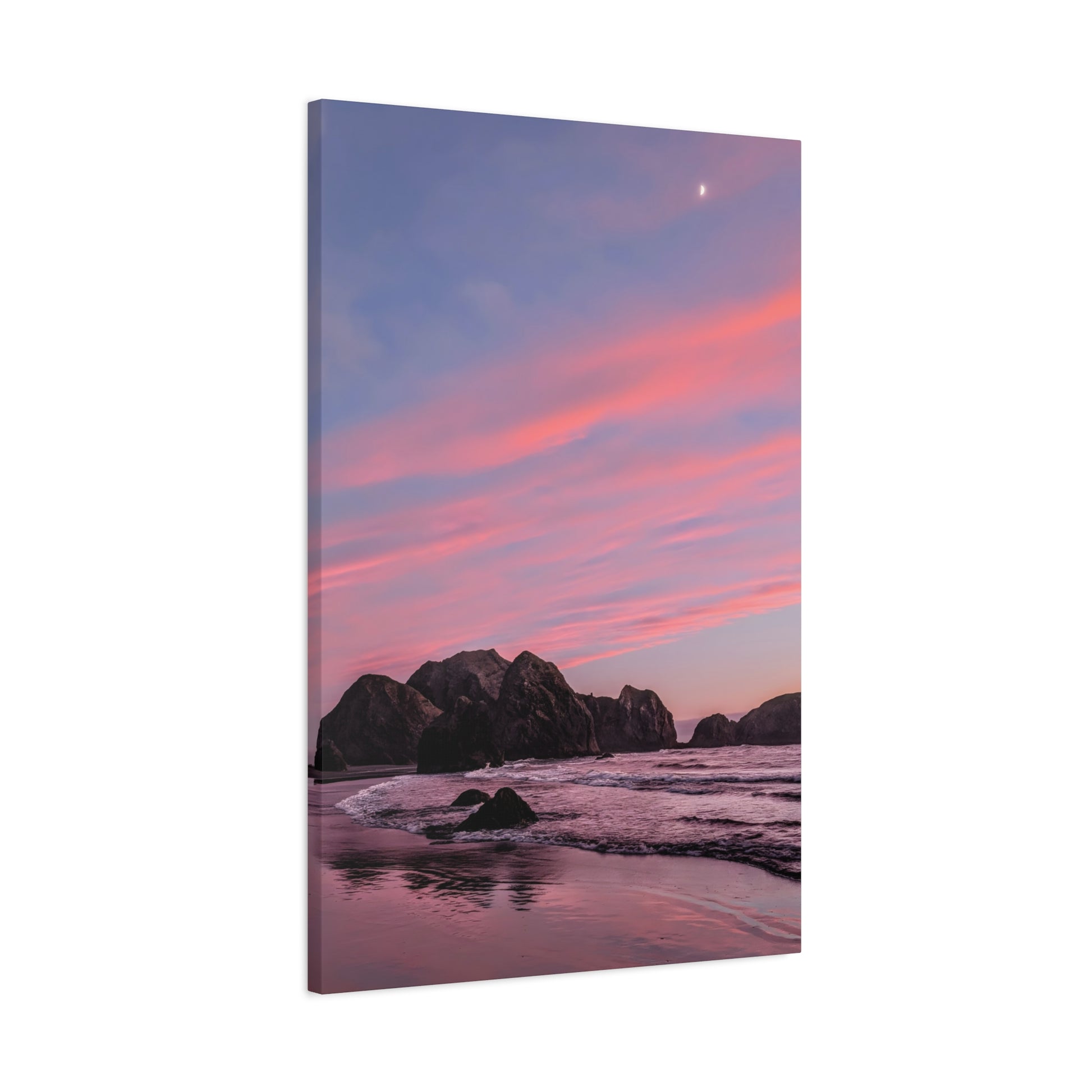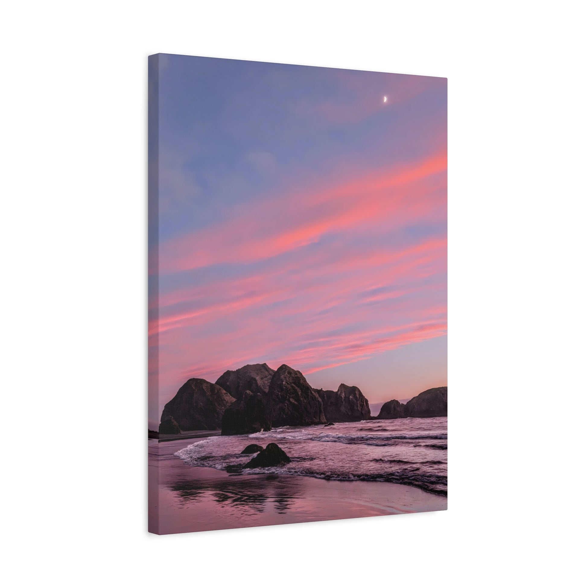 This epic Gold Beach sunset canvas captures the soft cranberry blush and muted rose tones as they melt into the sea. Shot on the shore at Meyers Creek Beach, this print is perfect for bathrooms, bedrooms, or as a gift. Brings the soft coastal vibe to your space and feel the calm.