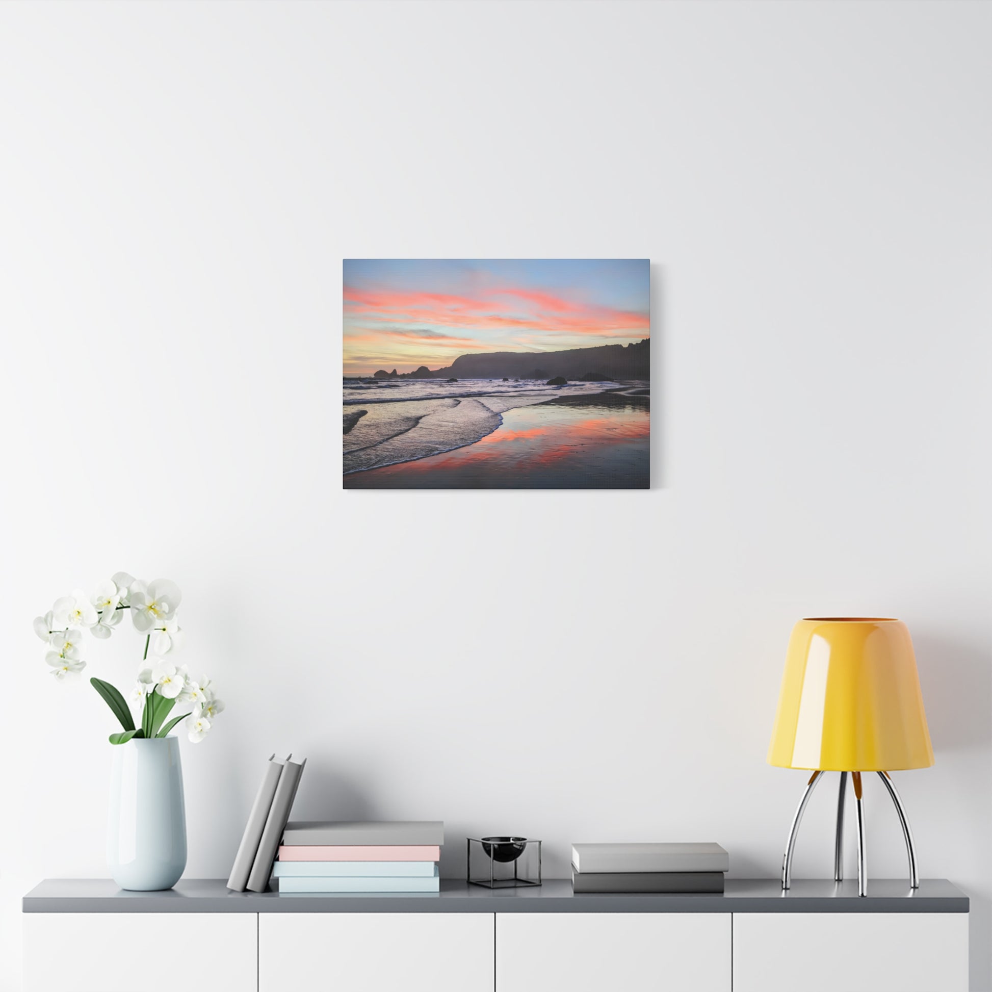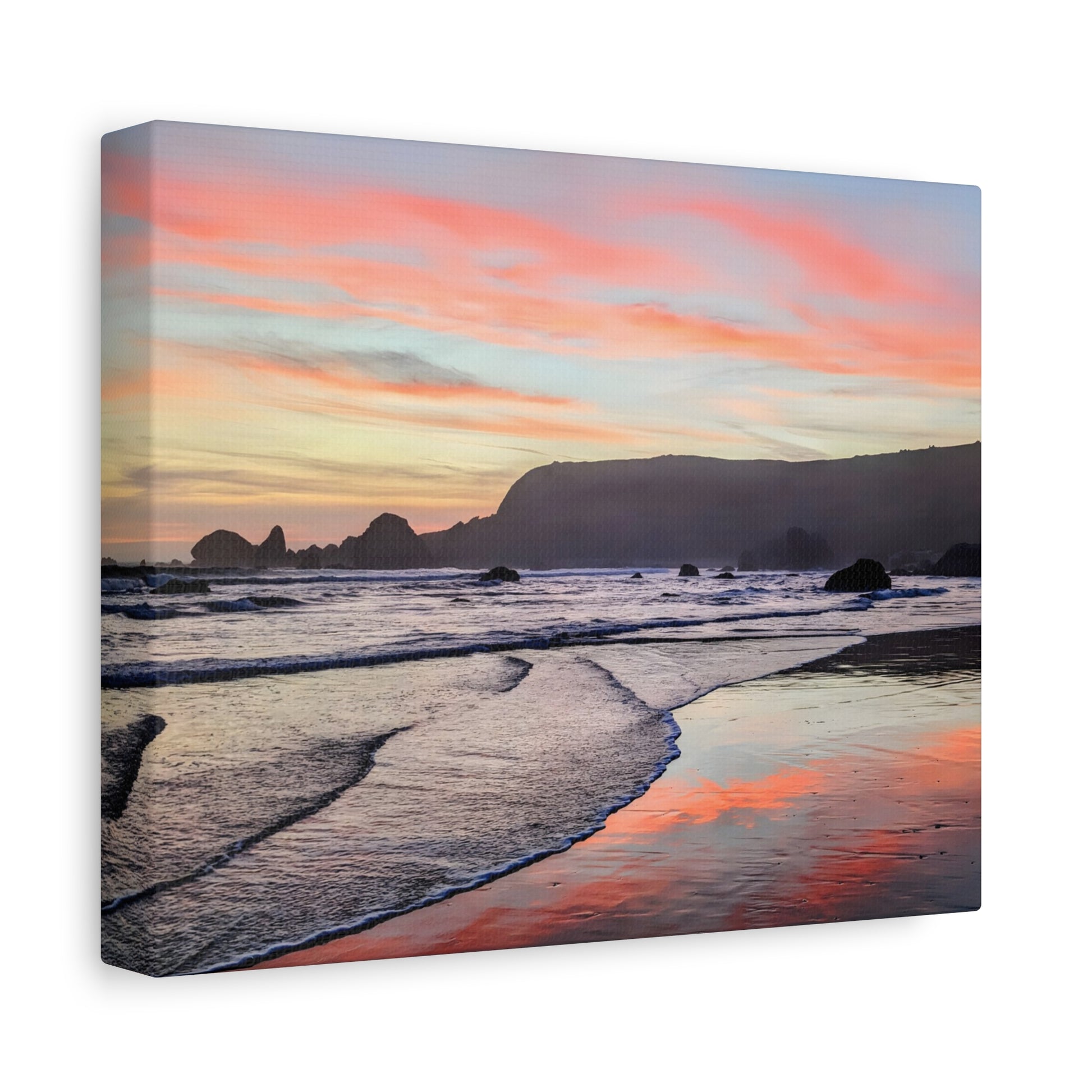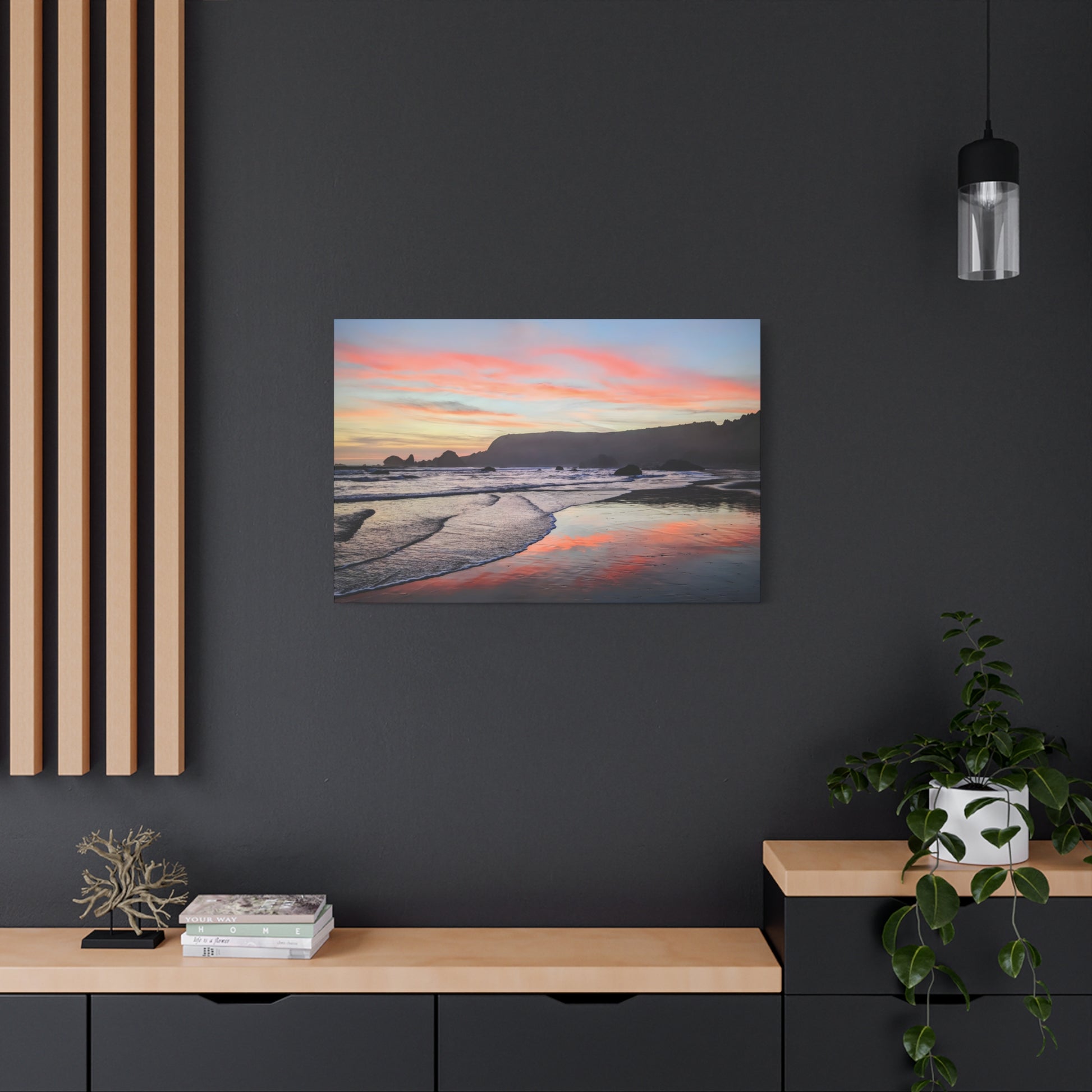 Transform your space with calm and warmth with this matte canvas art print. It captures a breathtaking sunset where the sky ignites in soft pinks and oranges over the peaceful ocean at Lone Ranch Beach. Perfect for nature lovers or anyone craving a chill vibe with a side of stunning coastal scenery, this artwork invites you to pause and breathe. Let this gorgeous piece elevate your space and spark some Zen in your life.
