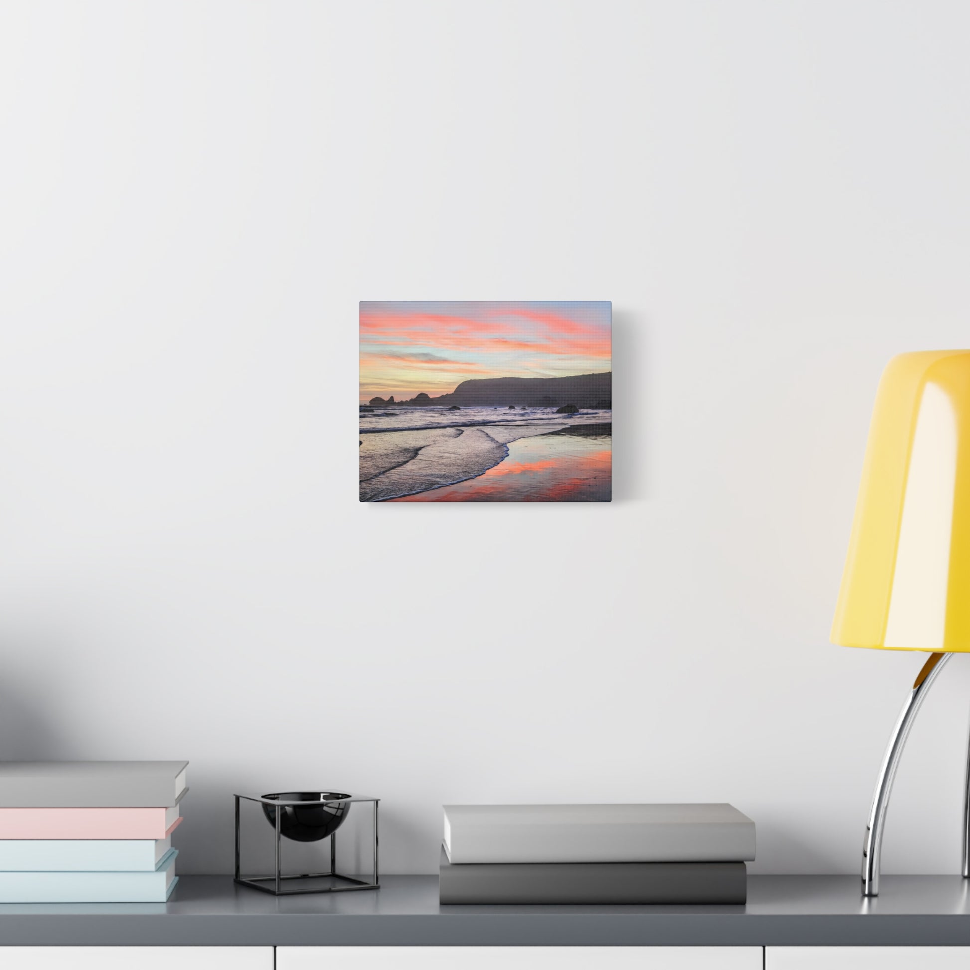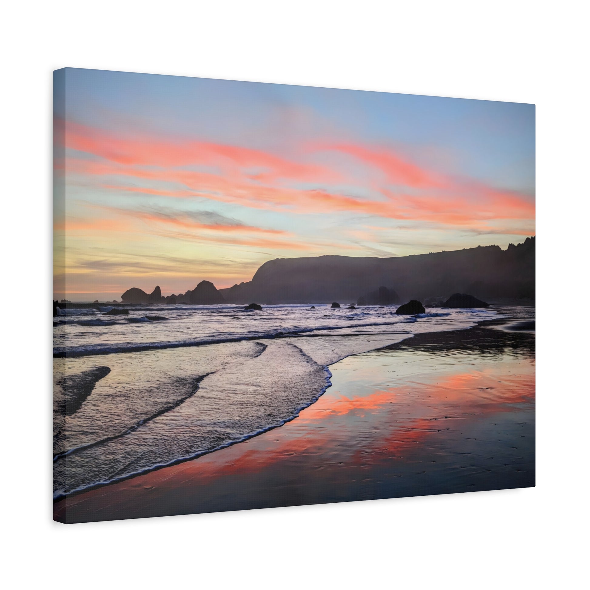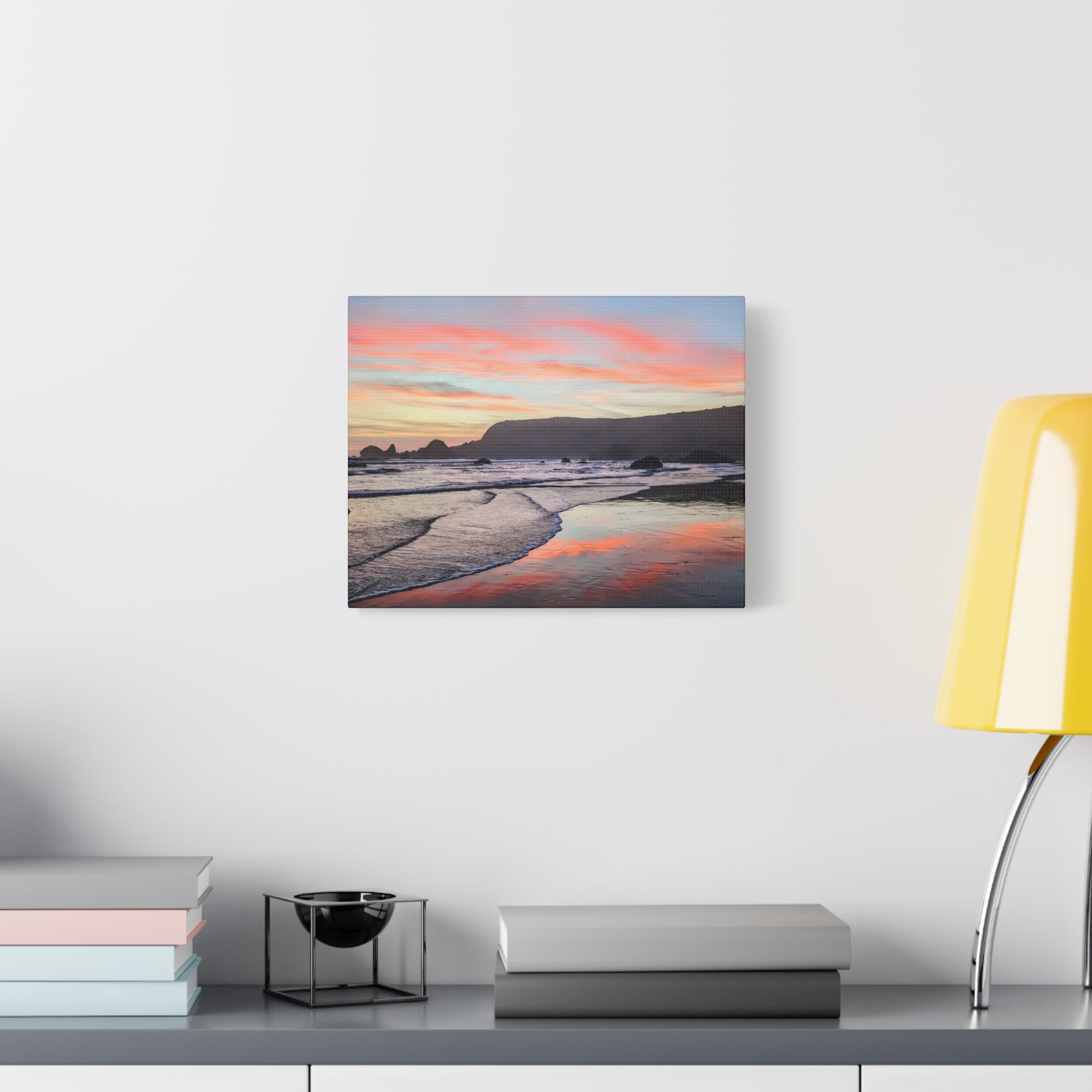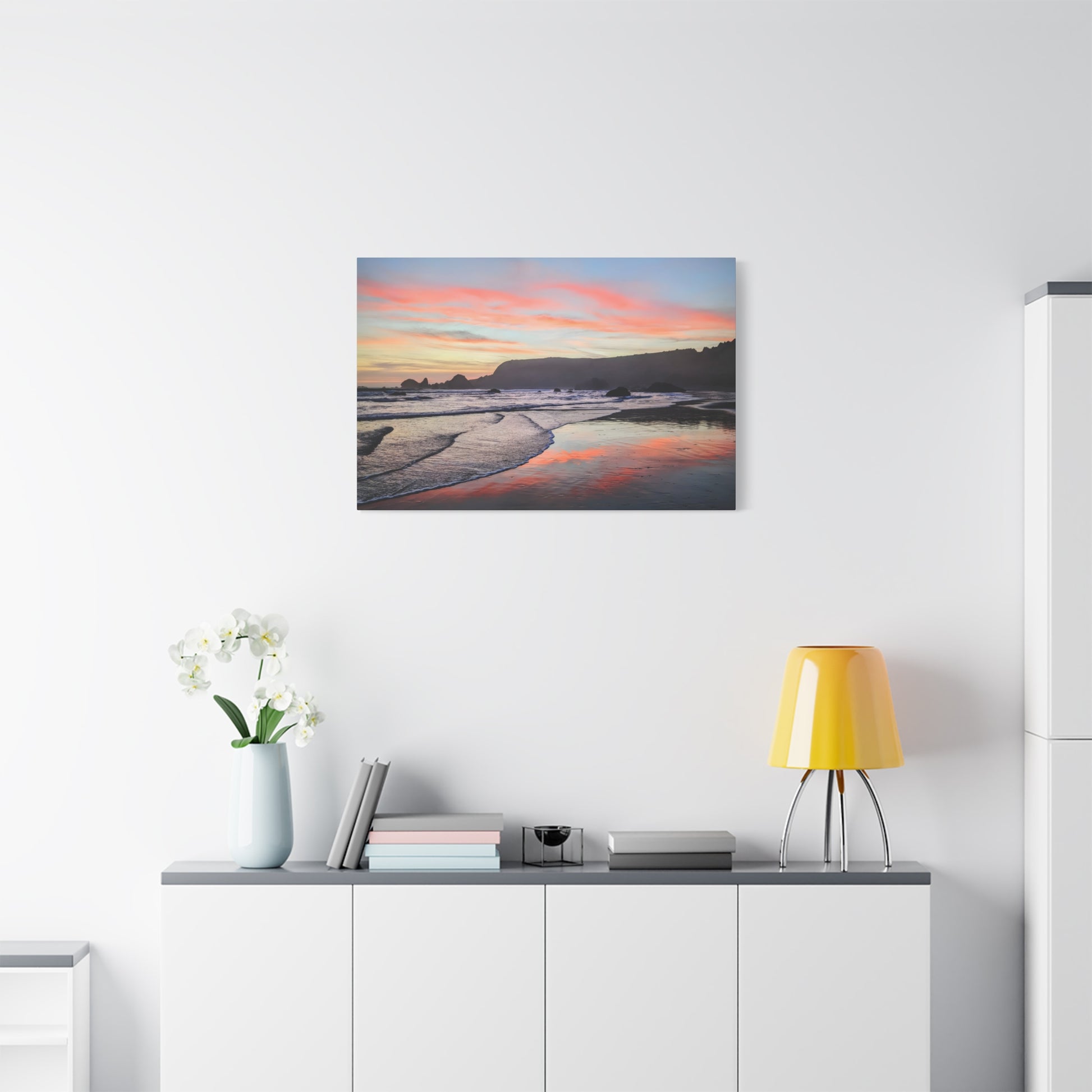 Transform your space with calm and warmth with this matte canvas art print. It captures a breathtaking sunset where the sky ignites in soft pinks and oranges over the peaceful ocean at Lone Ranch Beach. Perfect for nature lovers or anyone craving a chill vibe with a side of stunning coastal scenery, this artwork invites you to pause and breathe. Let this gorgeous piece elevate your space and spark some Zen in your life.