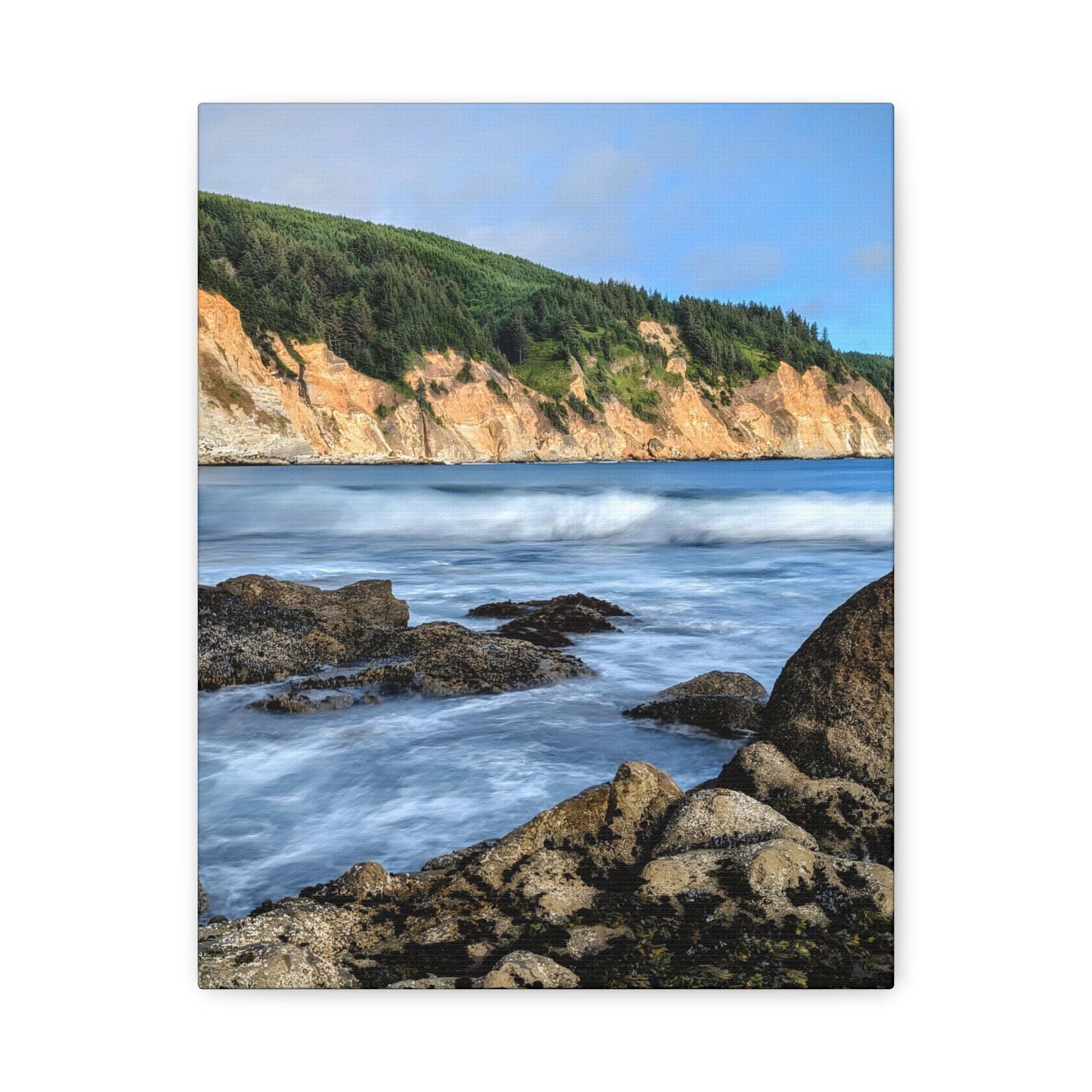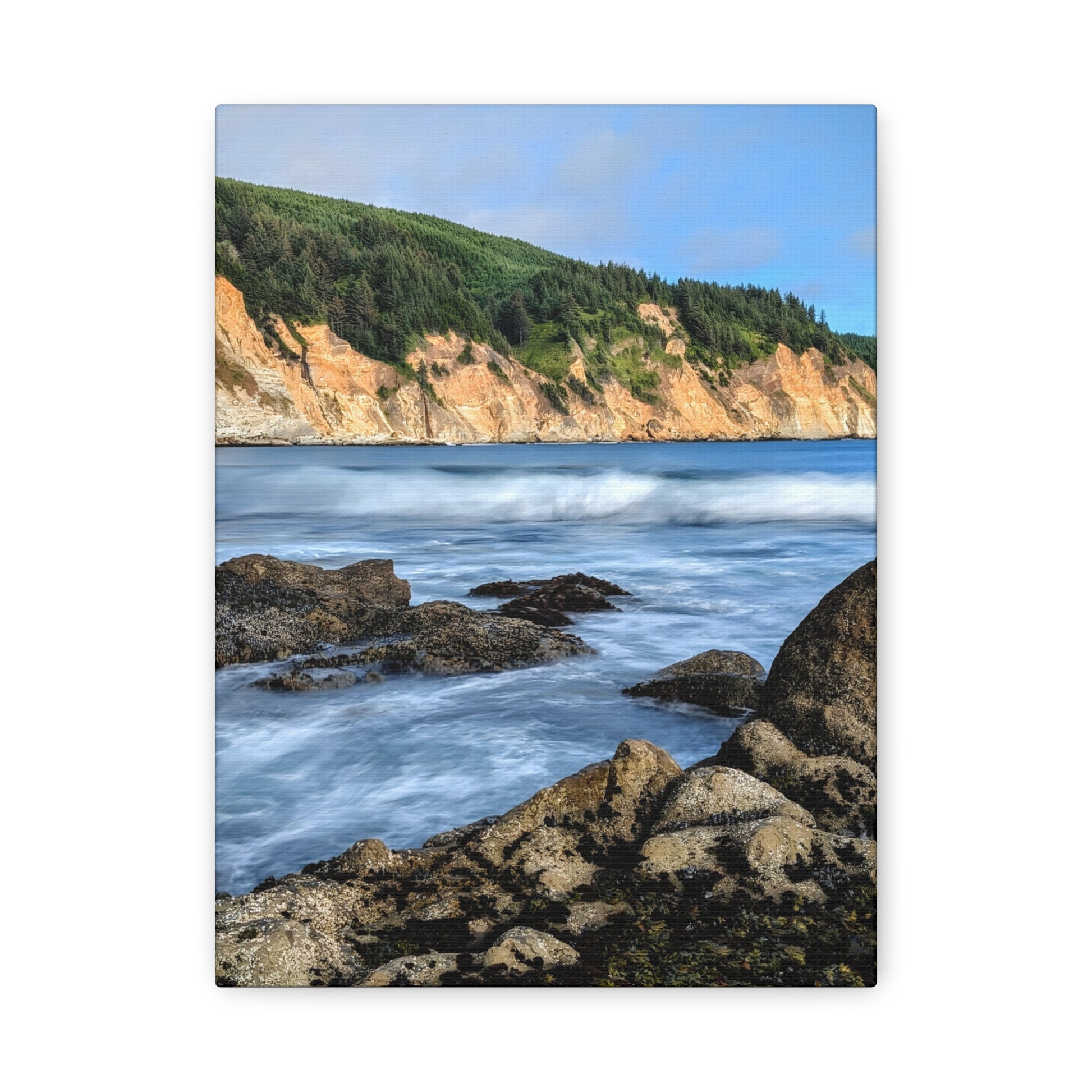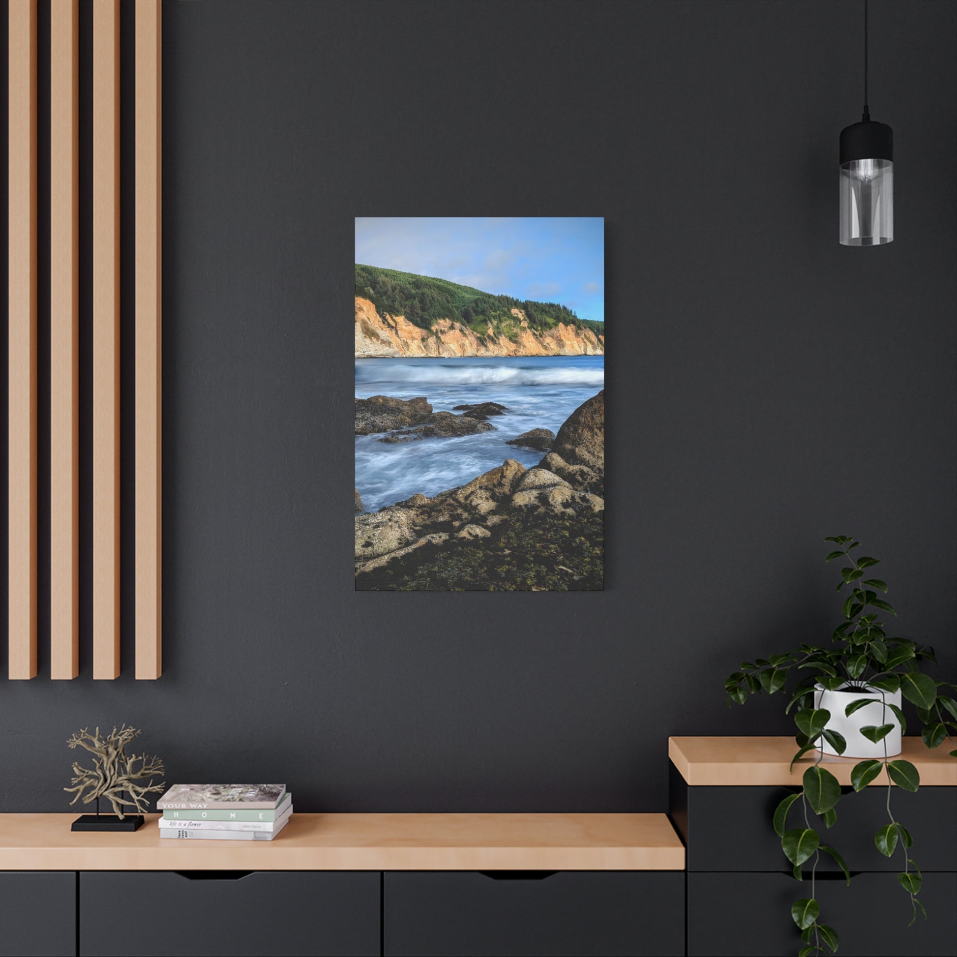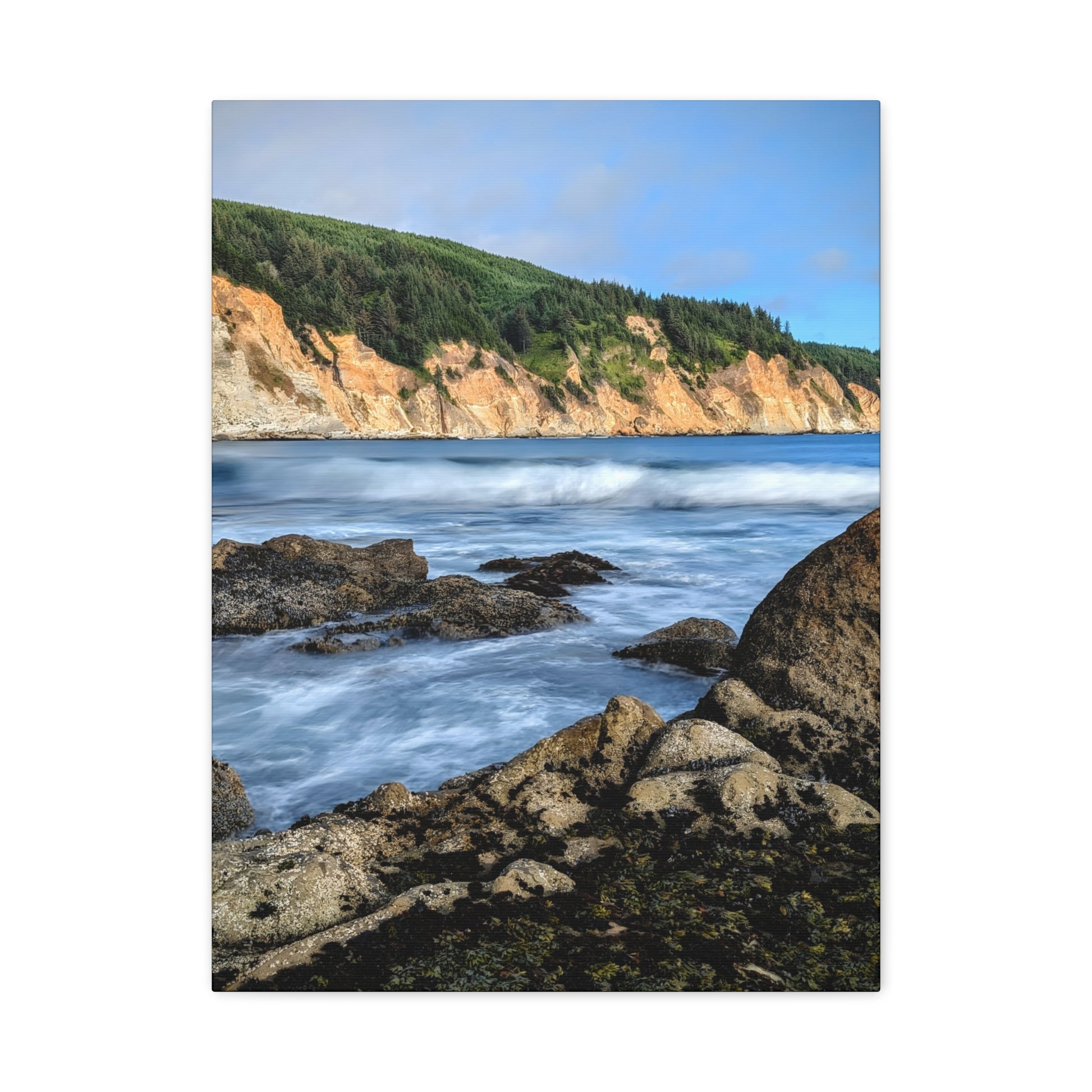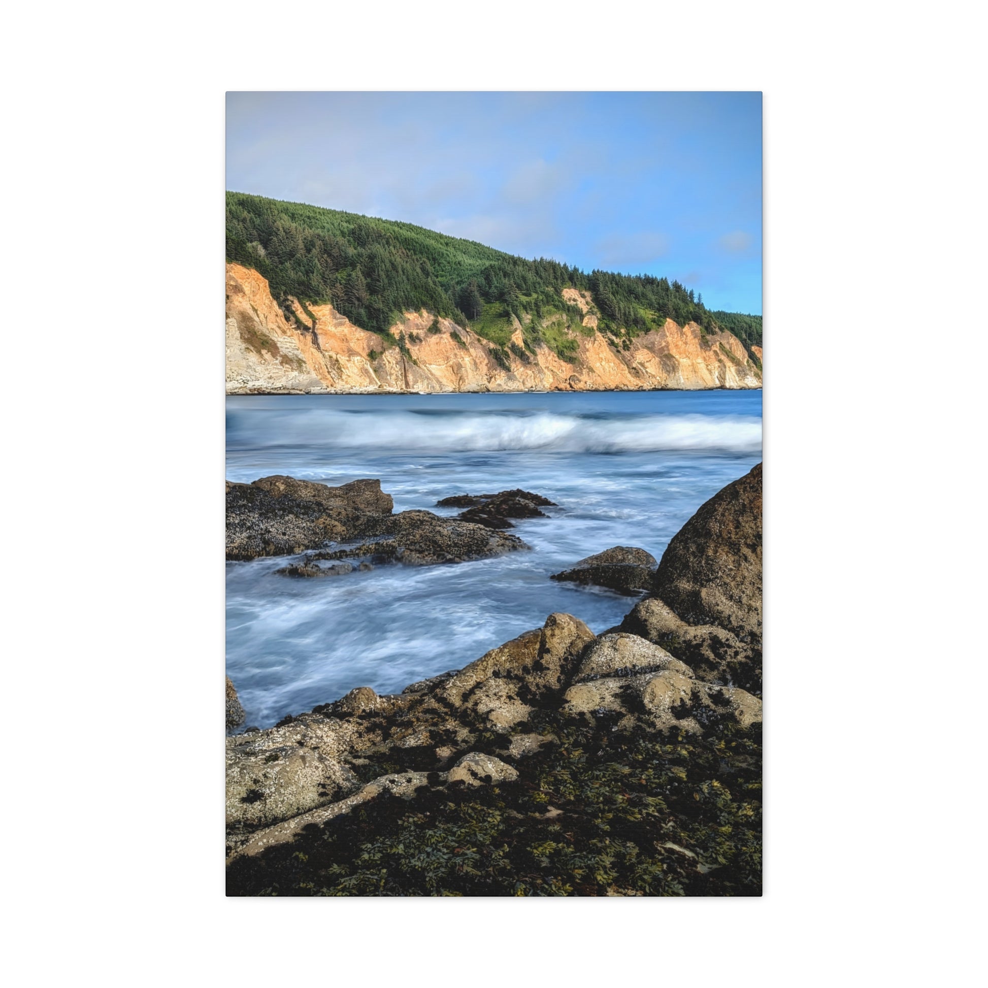 This serene Cape Arago South canvas captures the gentle movement of the tide as it winds through rock formations under a soft coastal sky. Perfect for bathrooms, bedrooms, or as a gift. Brings a quiet flow state to your space and invites you to breathe.