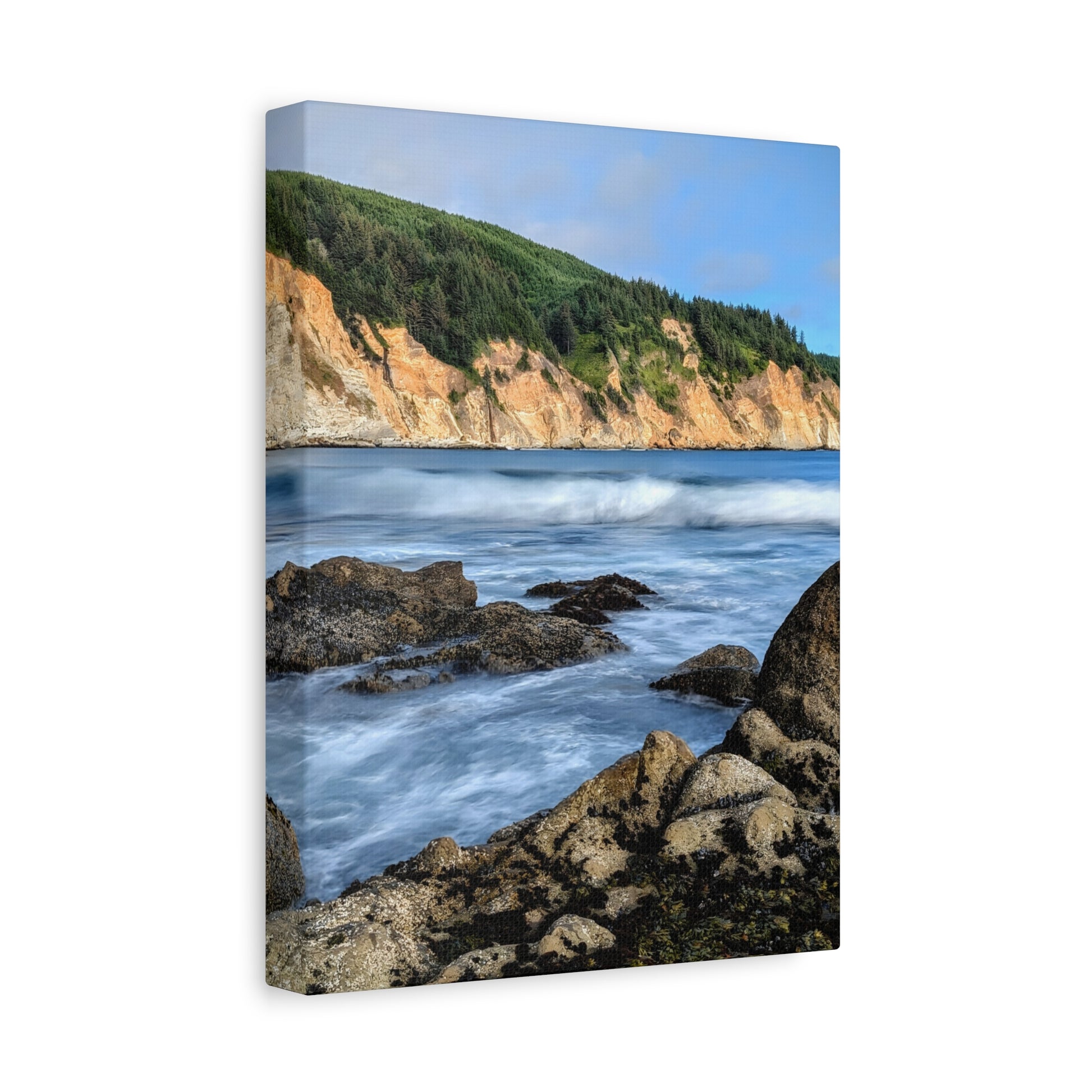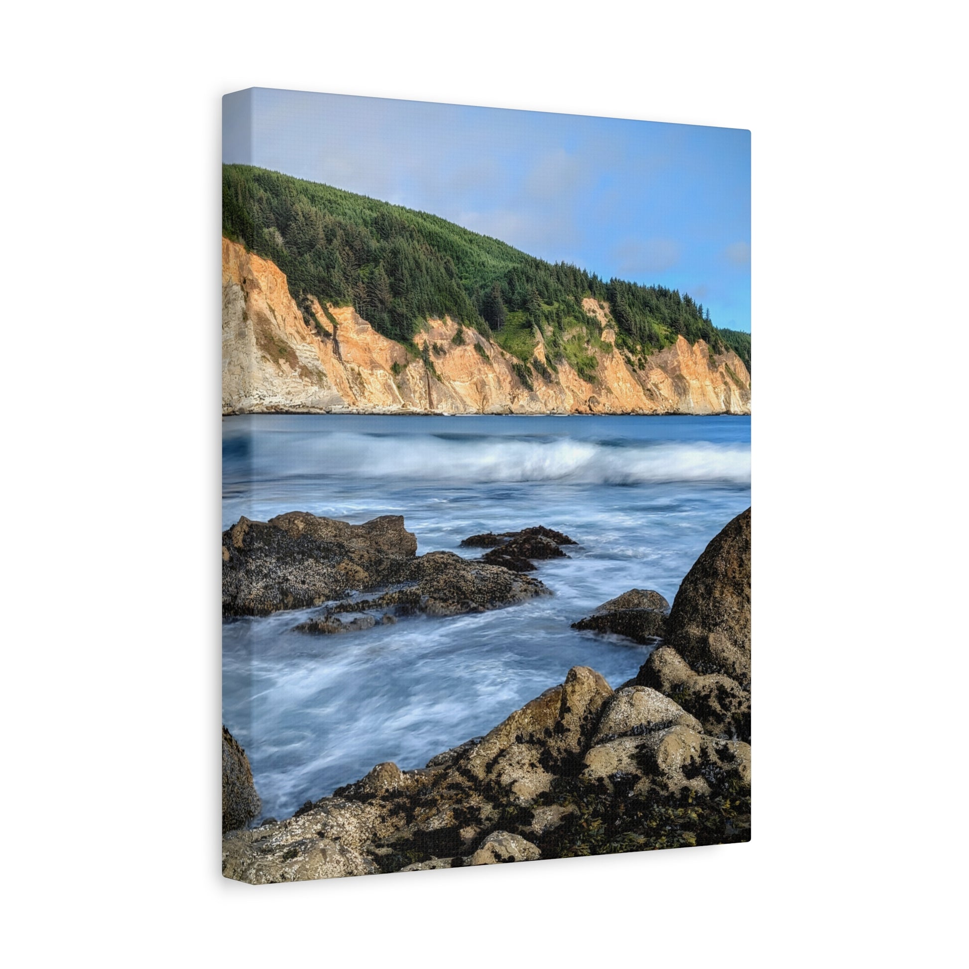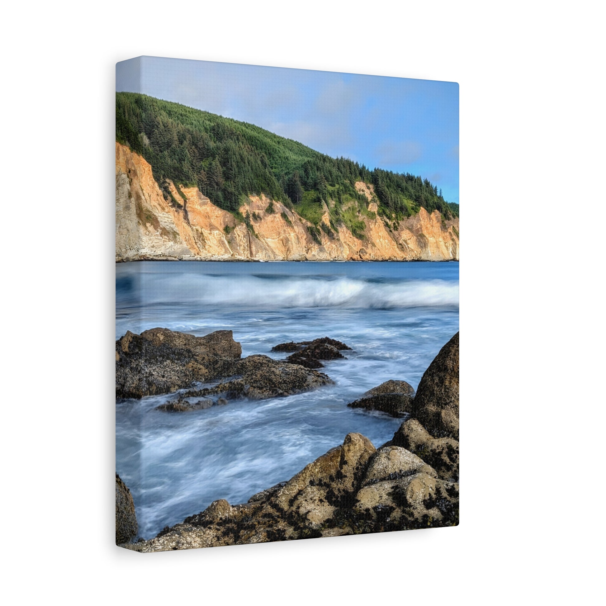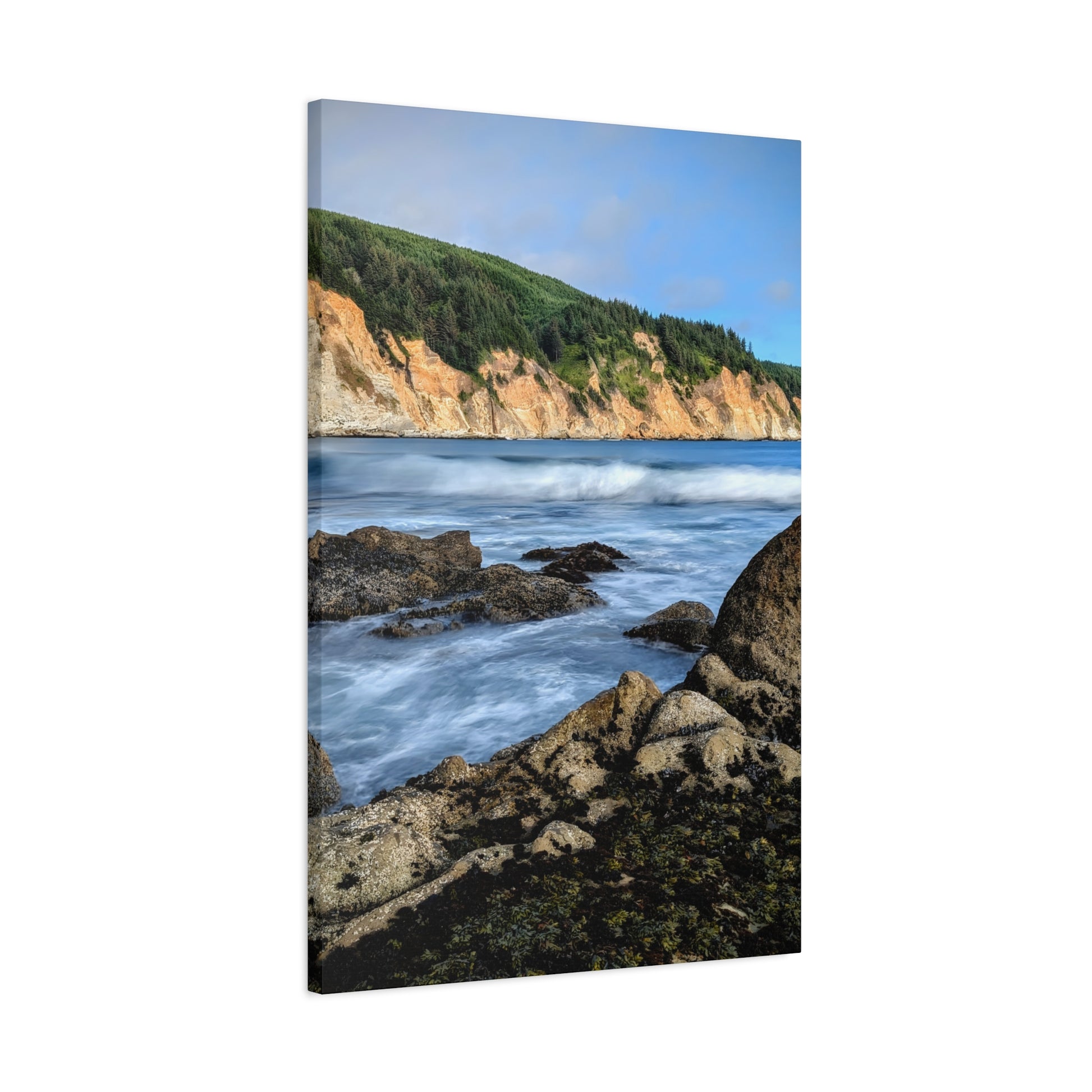 This serene Cape Arago South canvas captures the gentle movement of the tide as it winds through rock formations under a soft coastal sky. Perfect for bathrooms, bedrooms, or as a gift. Brings a quiet flow state to your space and invites you to breathe.
