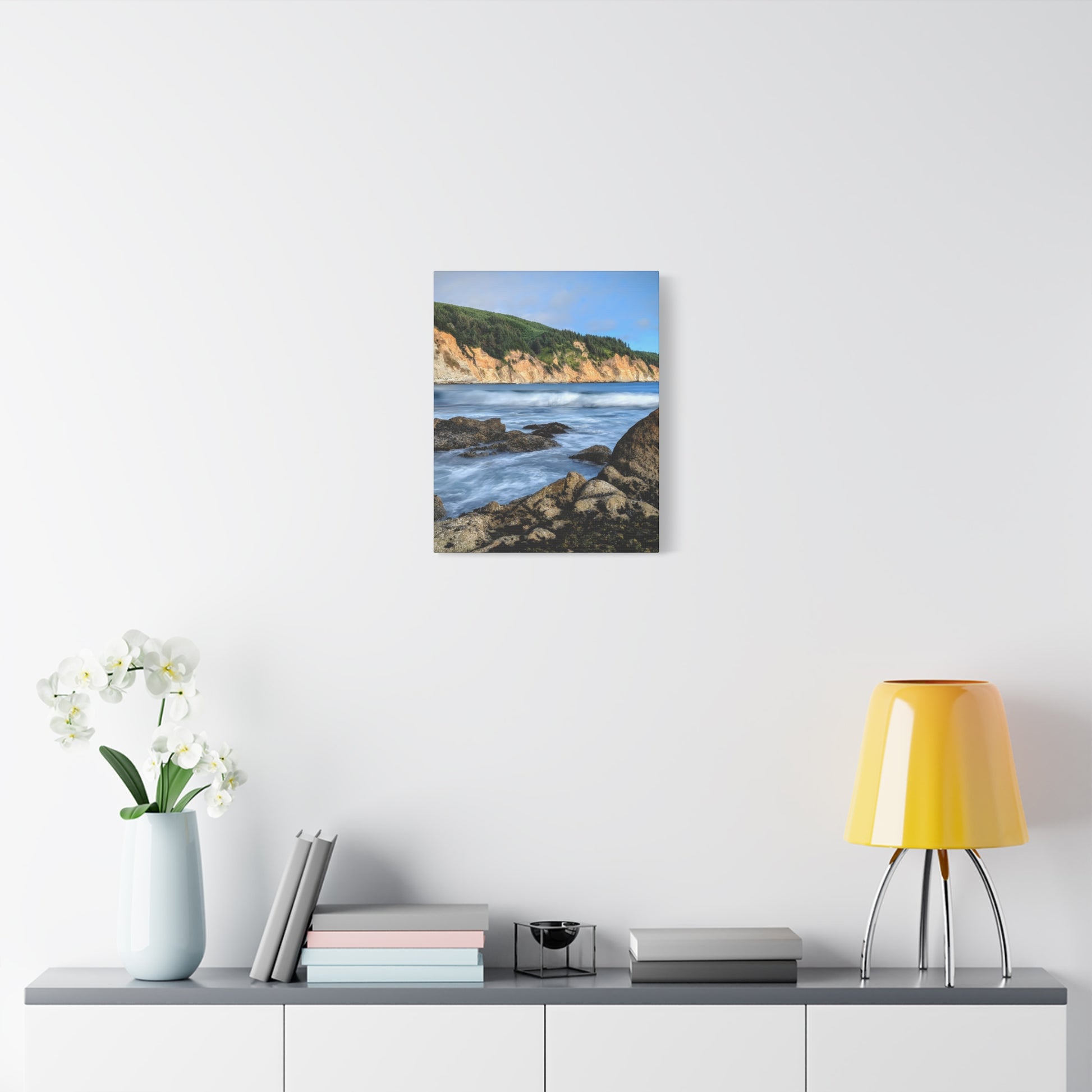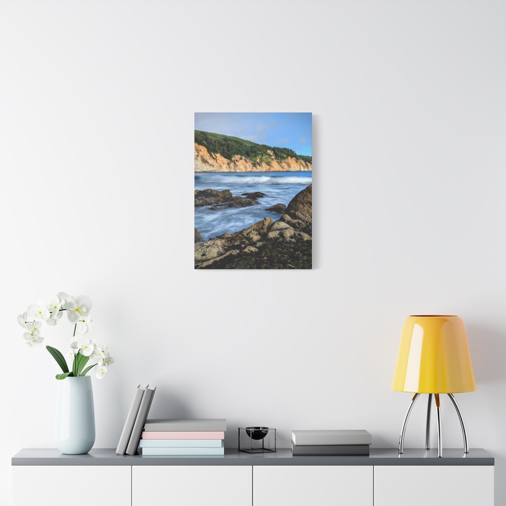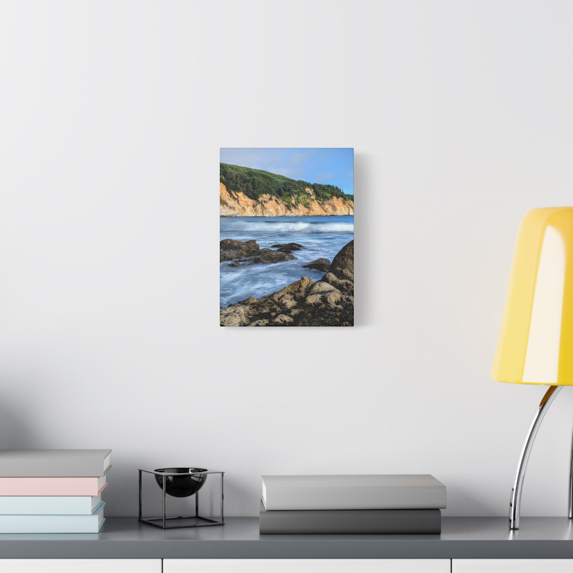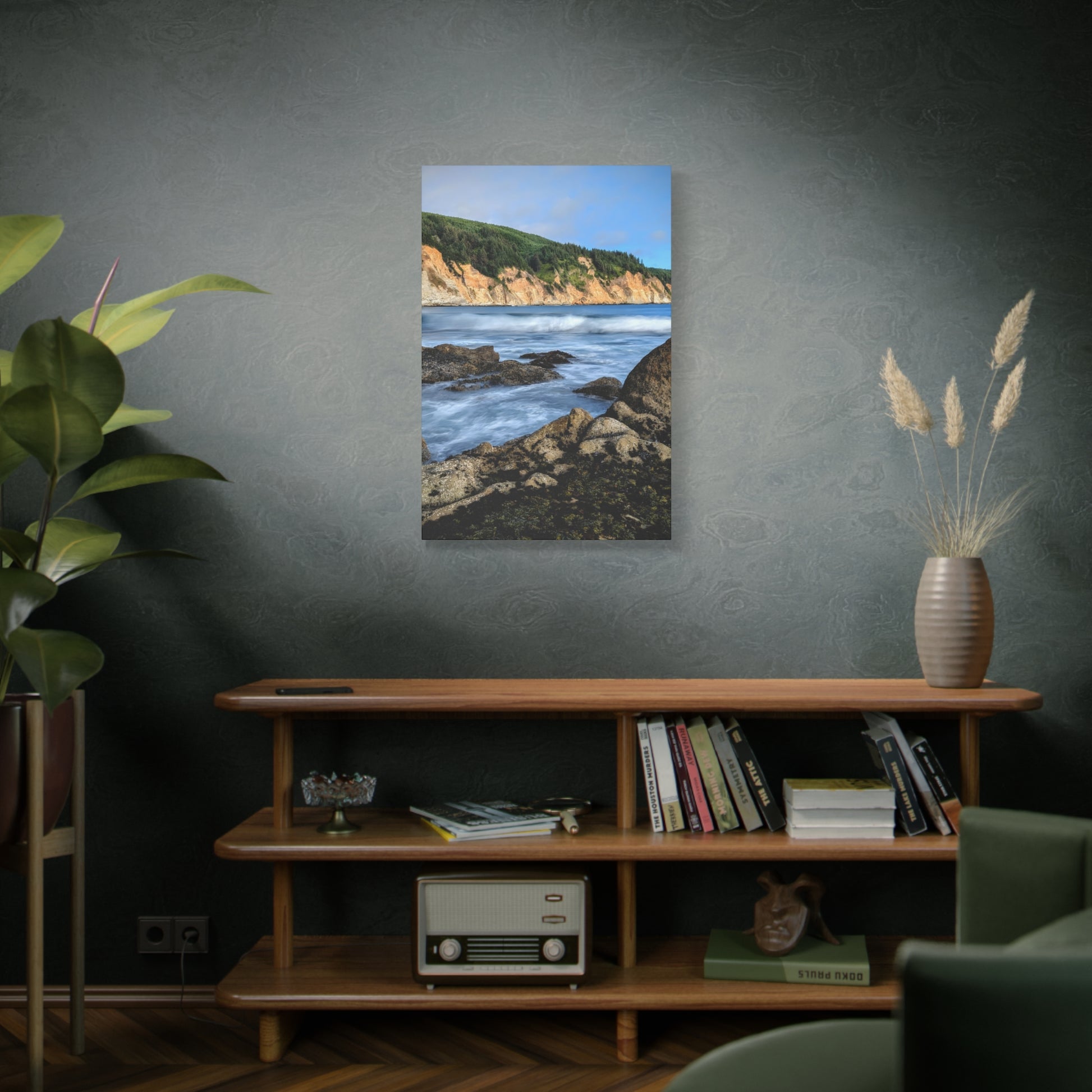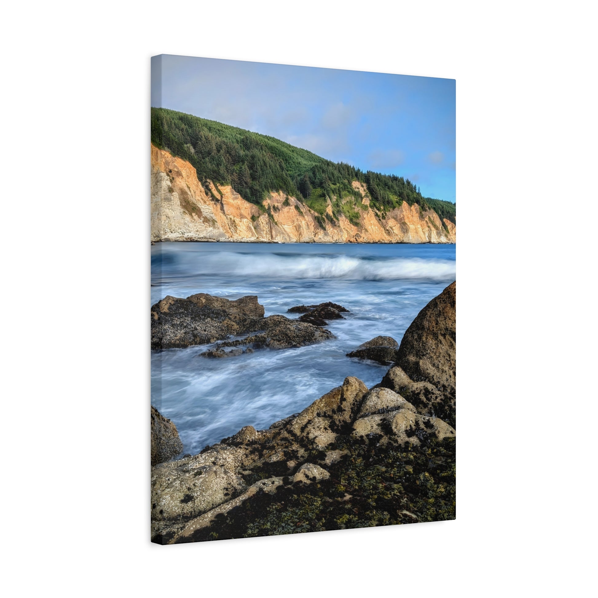 This serene Cape Arago South canvas captures the gentle movement of the tide as it winds through rock formations under a soft coastal sky. Perfect for bathrooms, bedrooms, or as a gift. Brings a quiet flow state to your space and invites you to breathe.