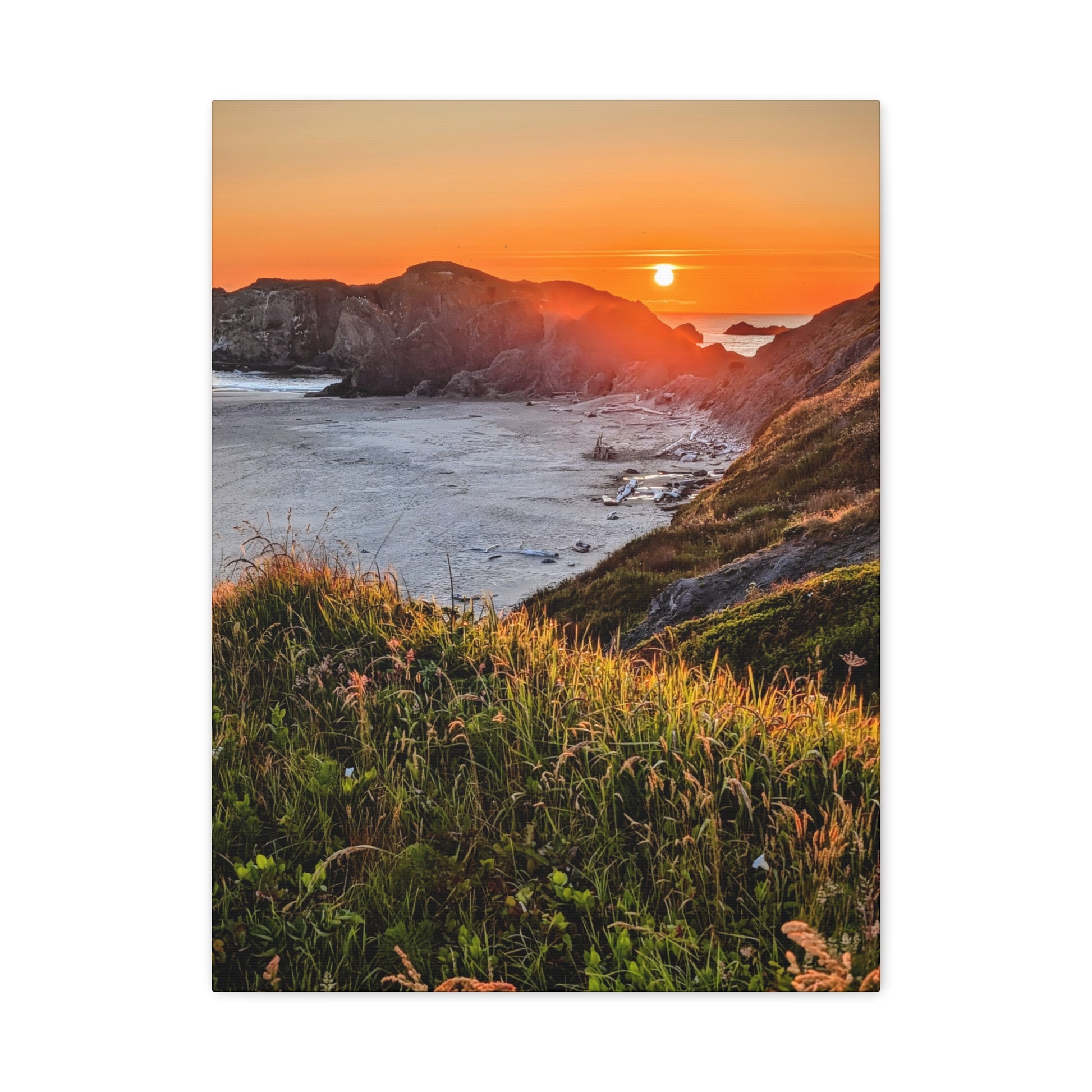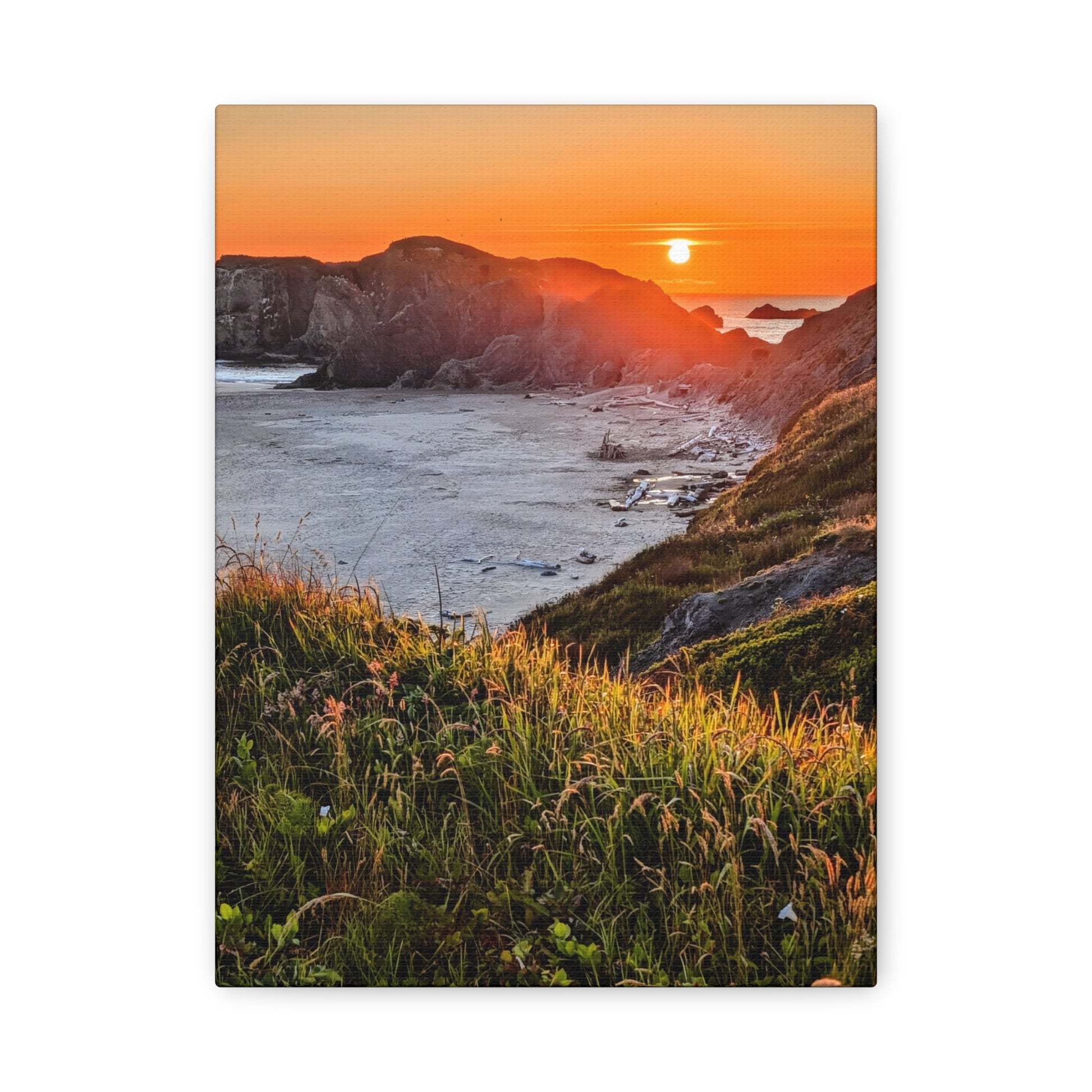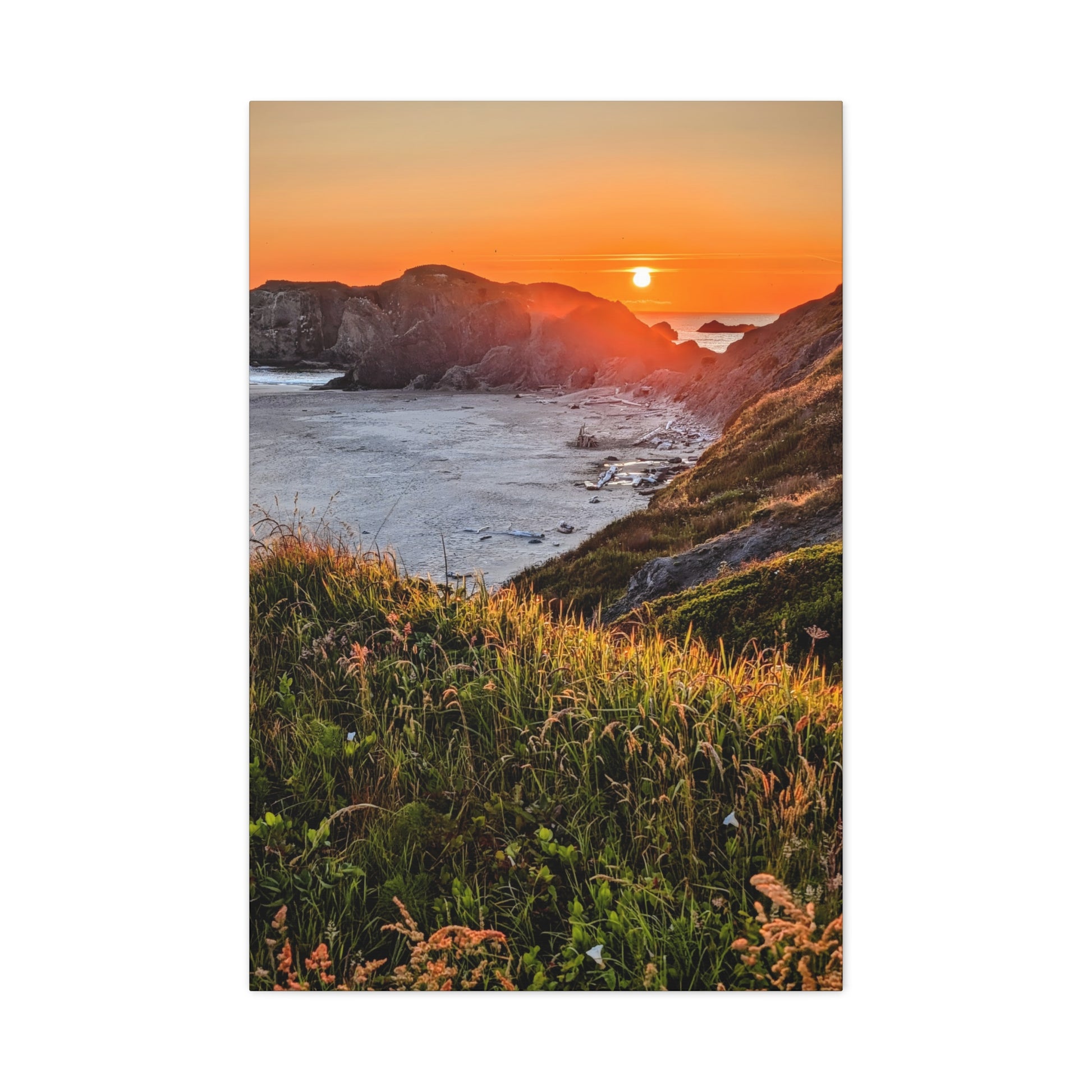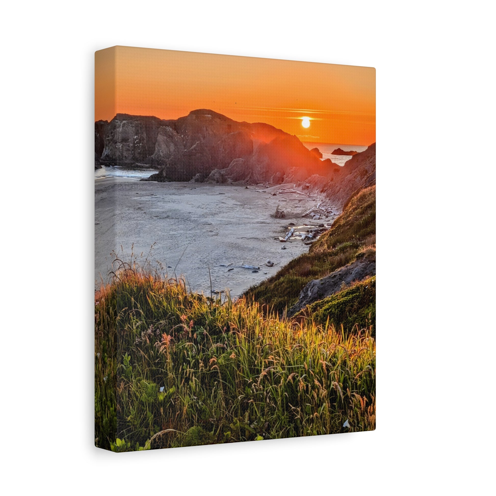 Transform your walls with a slice of the Oregon Coast, captured in that perfect golden hour glow. This matte canvas print brings the natural majesty of Coquille Point in Bandon where sunlit sea stacks meet rolling surf. Bring the peace into your space with intention.