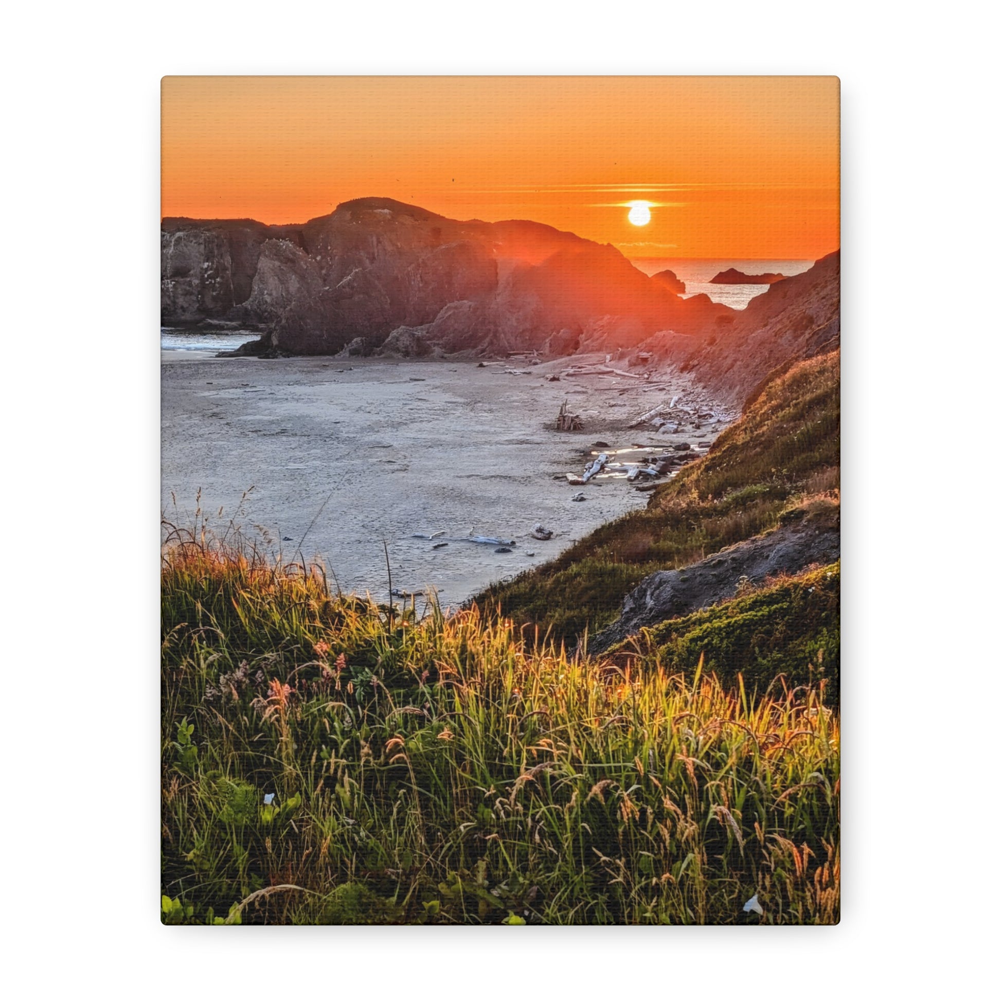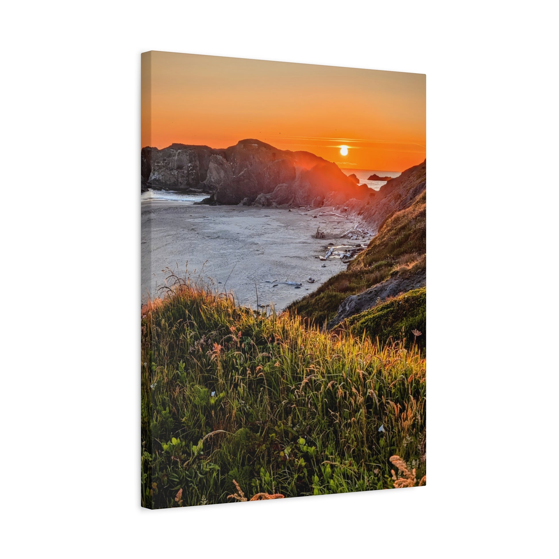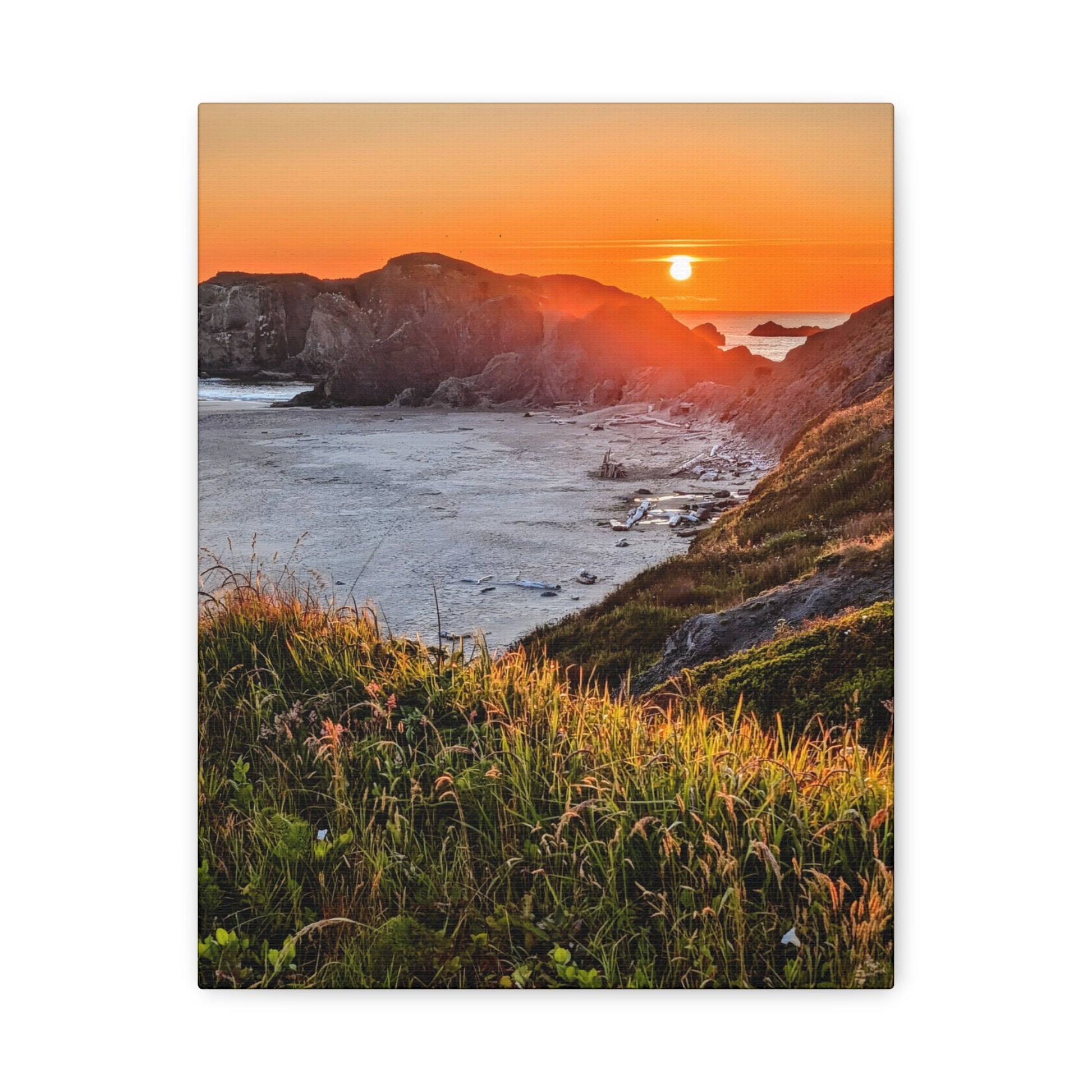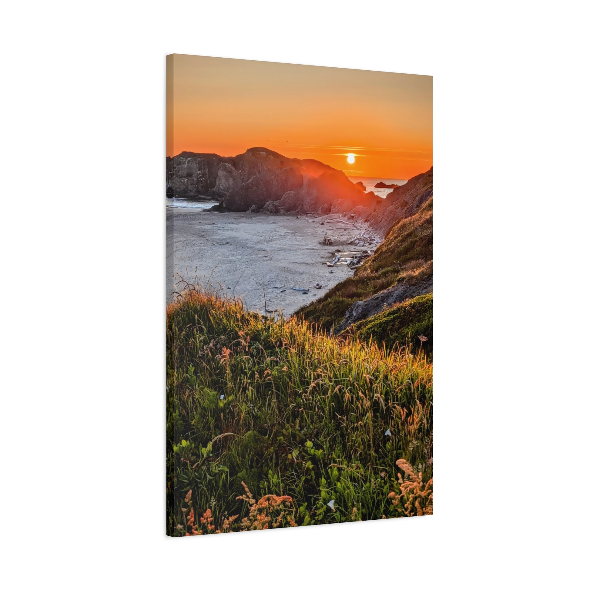 Transform your walls with a slice of the Oregon Coast, captured in that perfect golden hour glow. This matte canvas print brings the natural majesty of Coquille Point in Bandon where sunlit sea stacks meet rolling surf. Bring the peace into your space with intention.