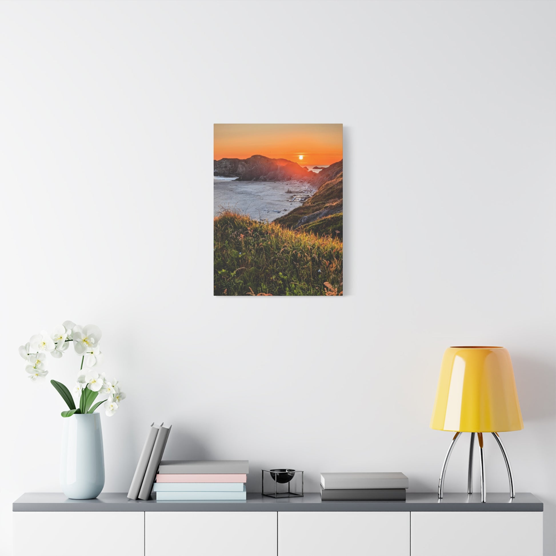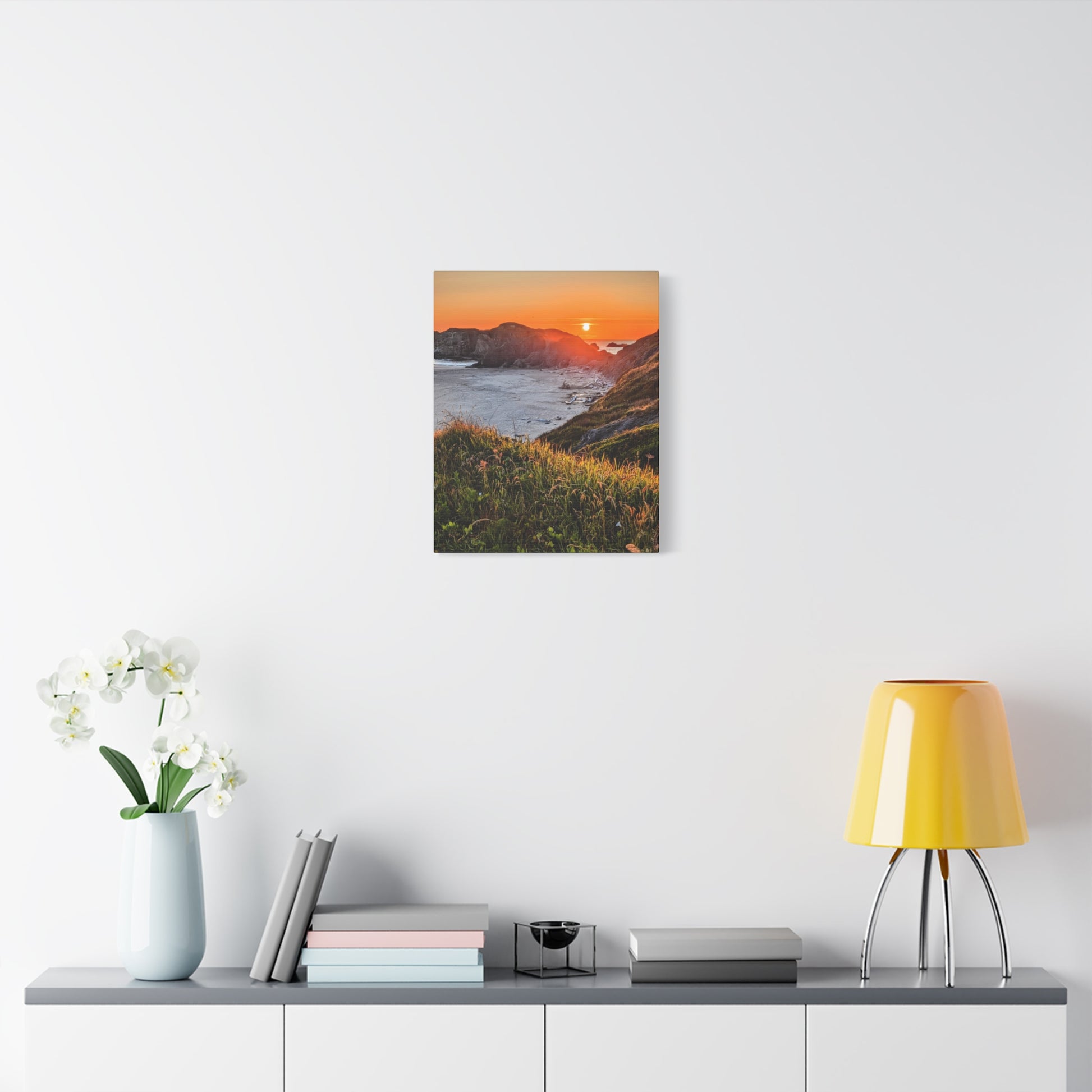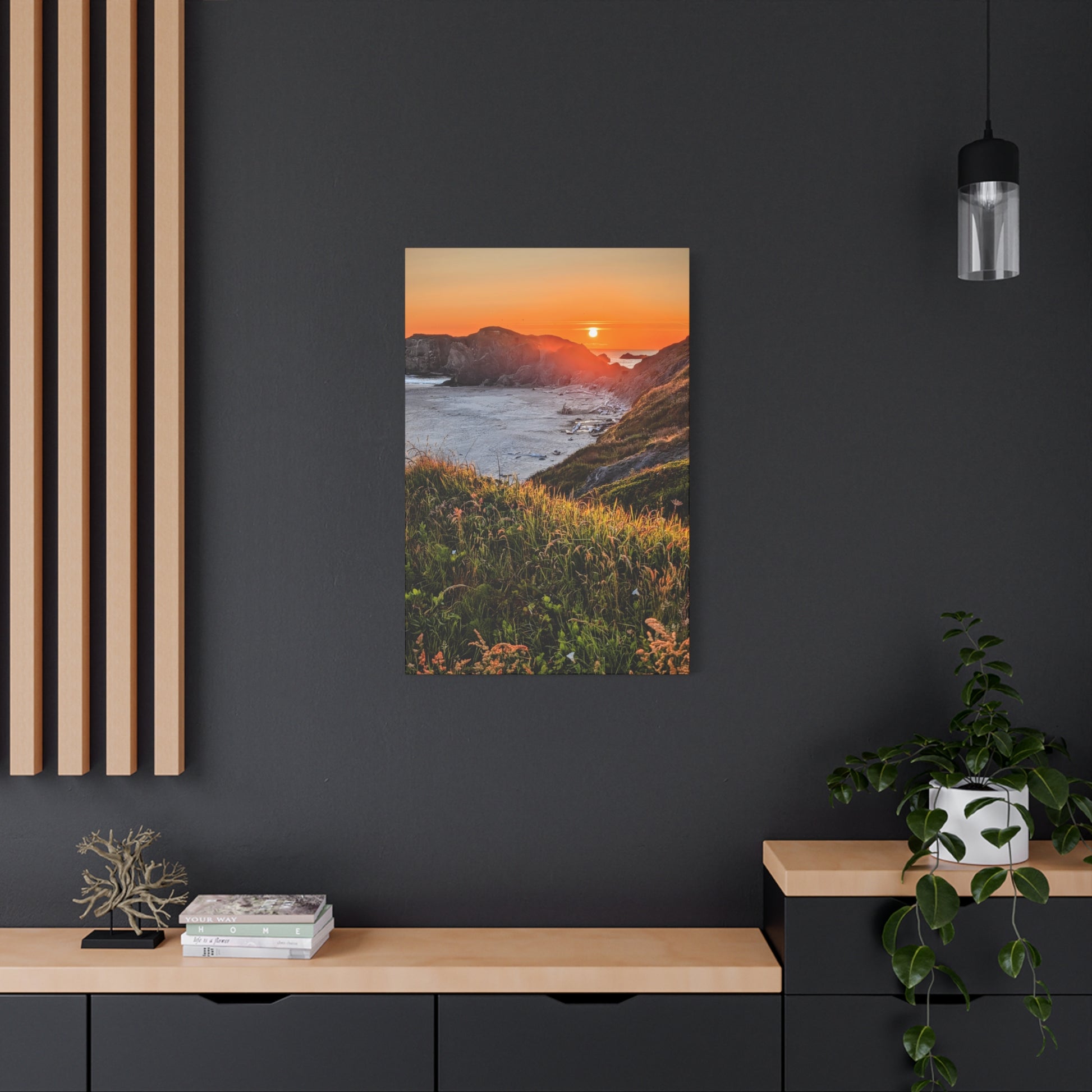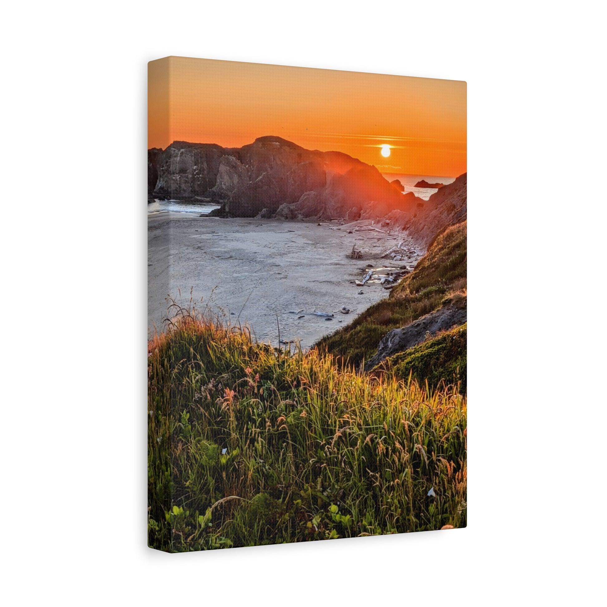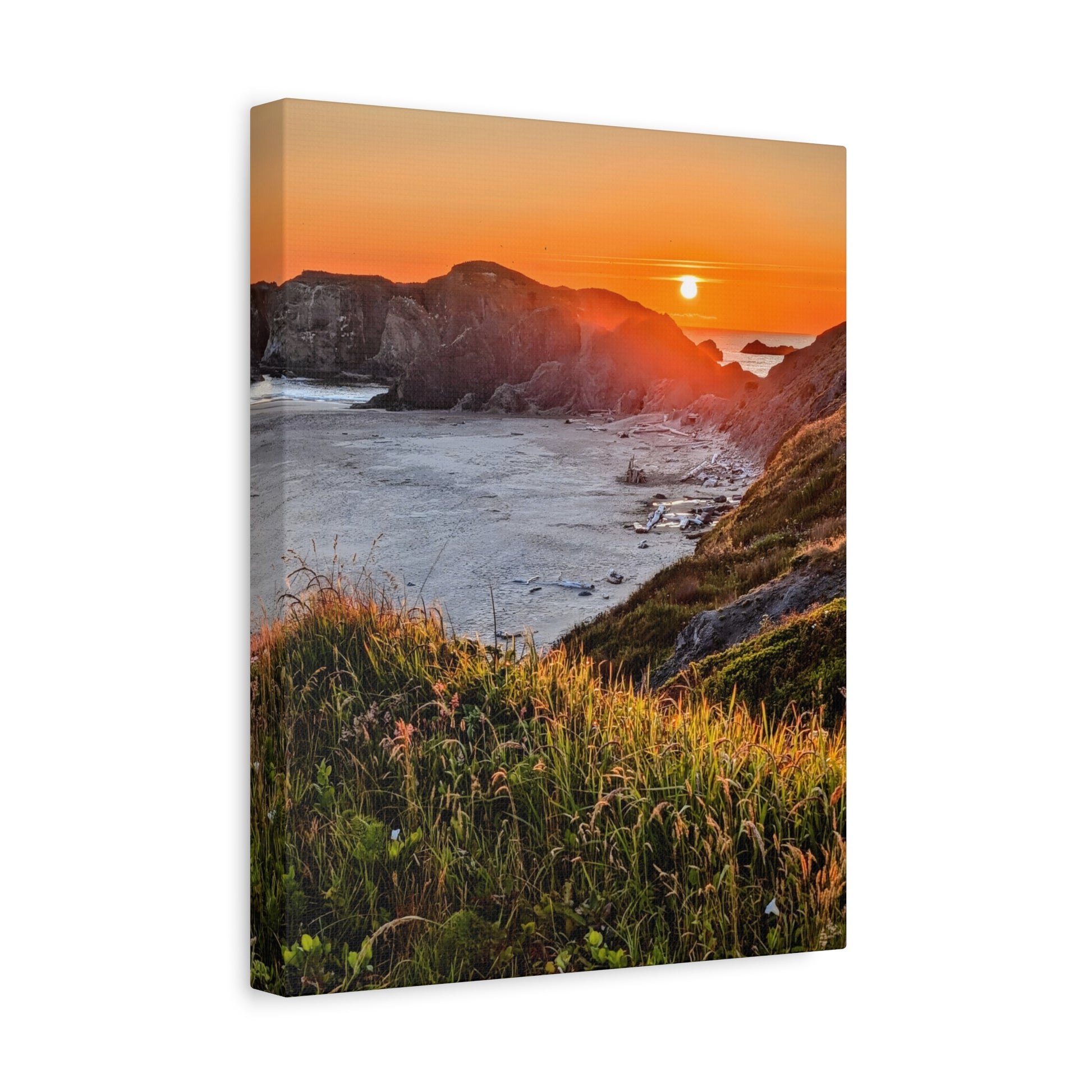 Transform your walls with a slice of the Oregon Coast, captured in that perfect golden hour glow. This matte canvas print brings the natural majesty of Coquille Point in Bandon where sunlit sea stacks meet rolling surf. Bring the peace into your space with intention.
