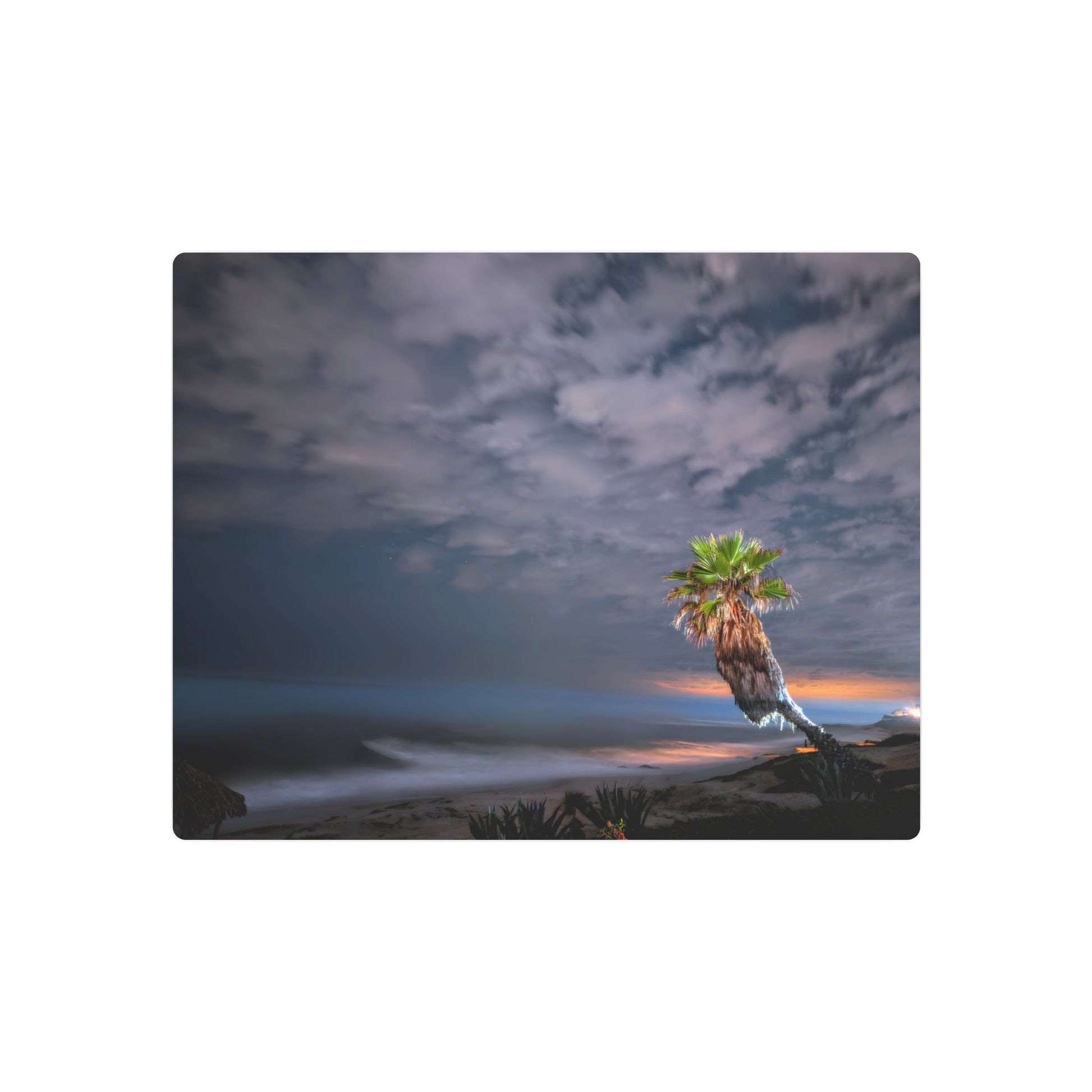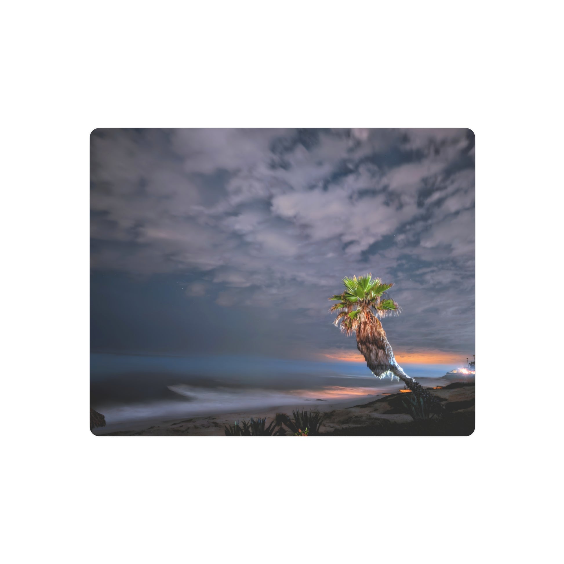 A single palm rises into the night at La Jolla, lit by a quiet glow that softens the sky. Patchy clouds drift across the frame, giving the scene a dreamlike calm - simple and timeless.